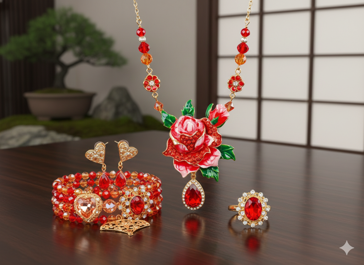 ツヤ感たっぷりの大きな薔薇を主役に、キラキラ輝くビジューやキュートなハート、ちょっぴりレトロな扇パーツまで、女の子の「ときめき」をこれでもかとギュッと詰め込みました💎❤️