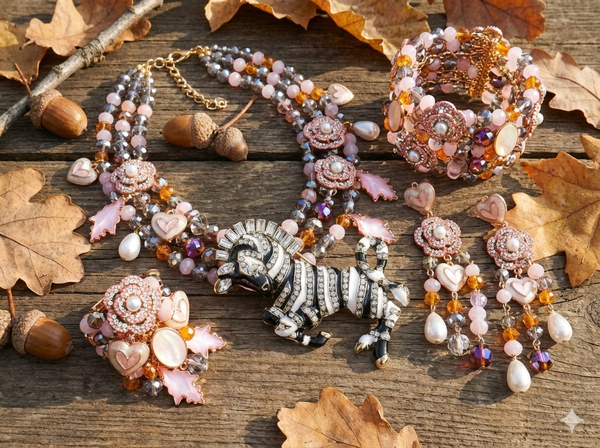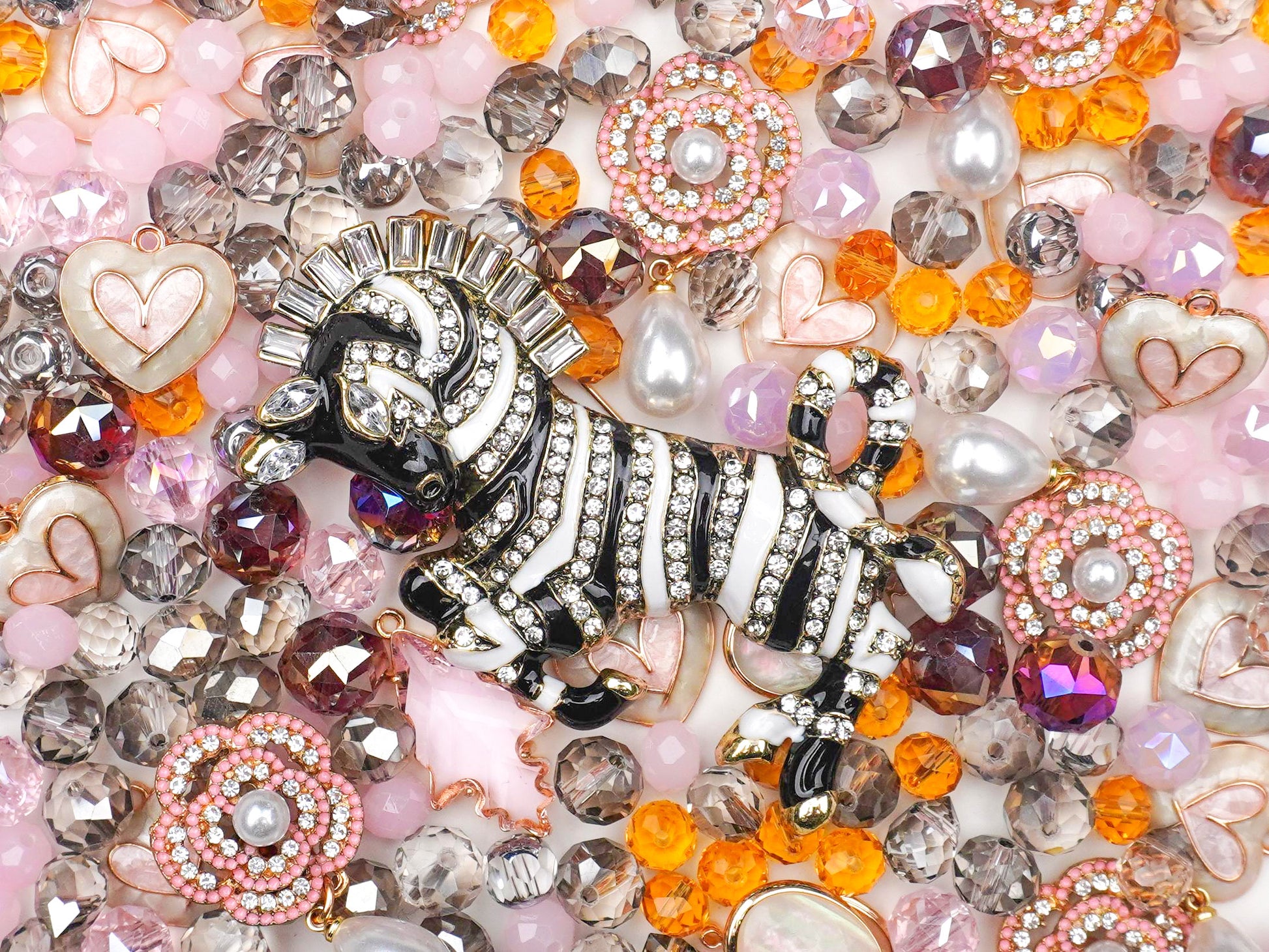 クールなモノトーンのシマウマに、あえてパール付きのピンクのお花や、優しいハートのチャームを合わせるのが今っぽスタイル💖。そこにアンバー(琥珀色)やスモーキーグレーのビーズを散りばめることで、子供っぽくならない絶妙な「大人の甘辛ミックス」が完成🥀。