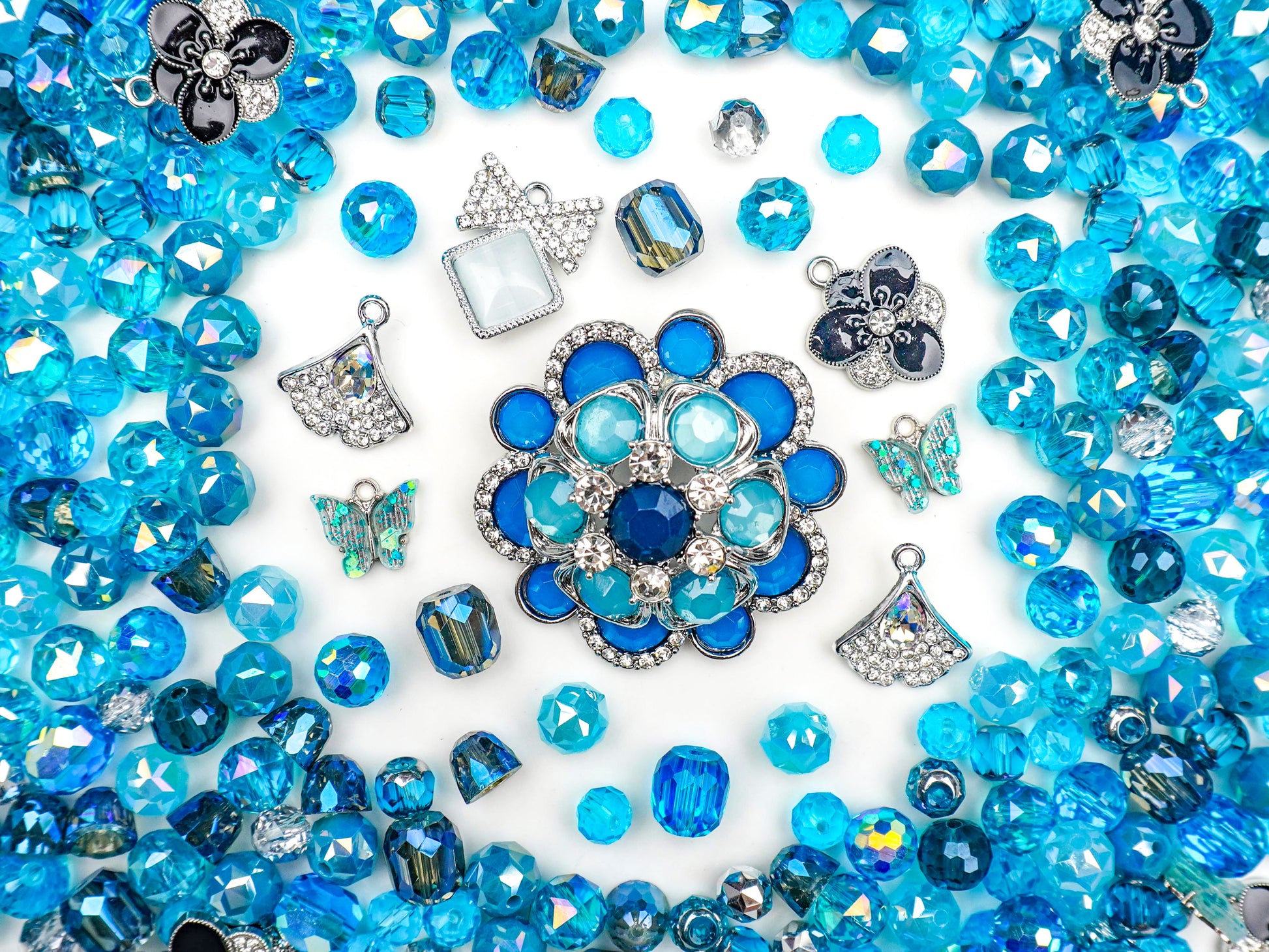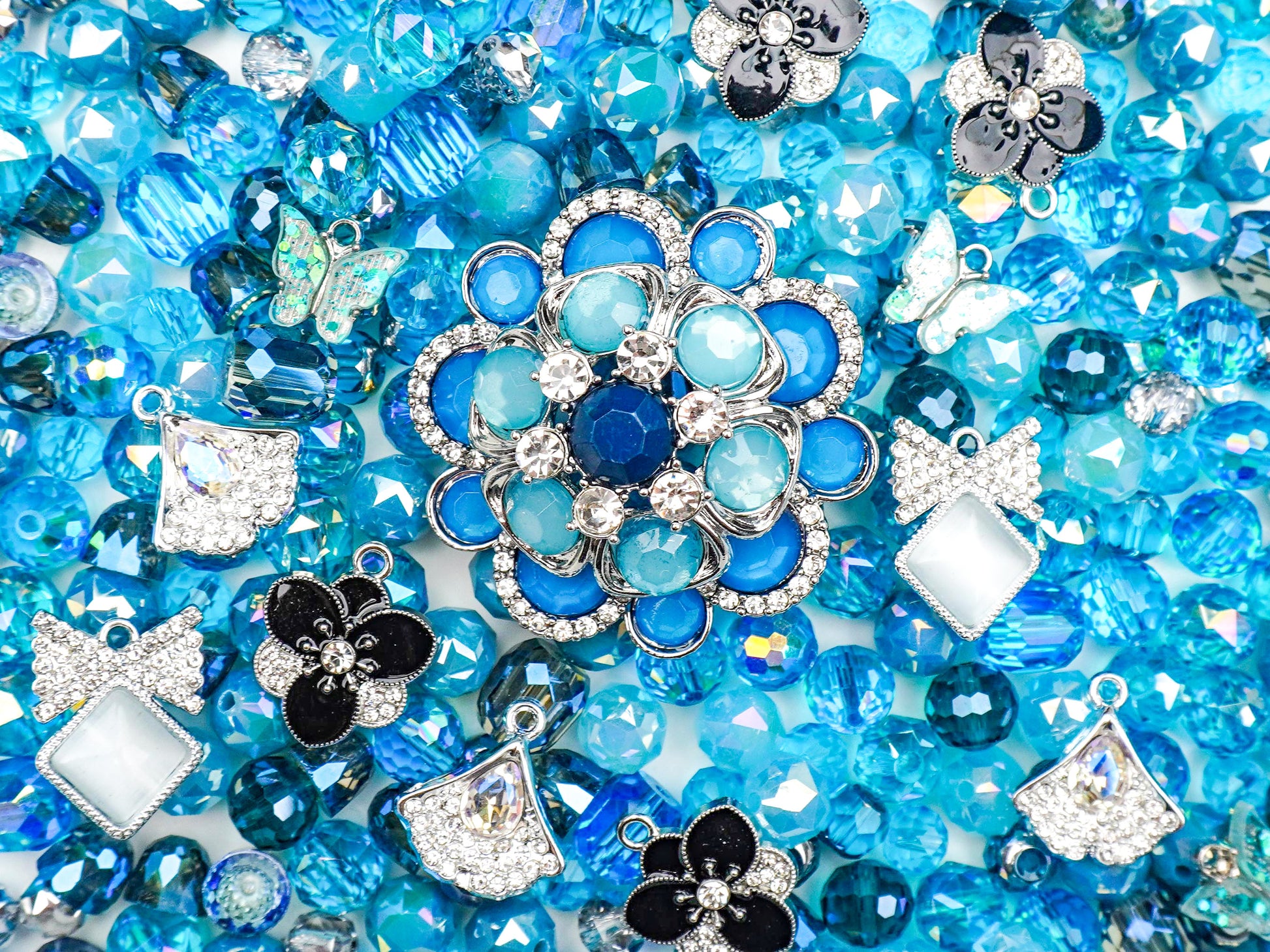 周りを彩るシルバーの扇(ファン)や、小さな蝶々のチャームが、涼しげで上品なアクセントになってるの🦋。多面カットされたビーズが光を反射して、まるで海や空を閉じ込めたみたいに輝くよ🌊。この完璧な「青」のグラデーションは、青色担当の推しがいる子には絶対に刺さるはず💙。