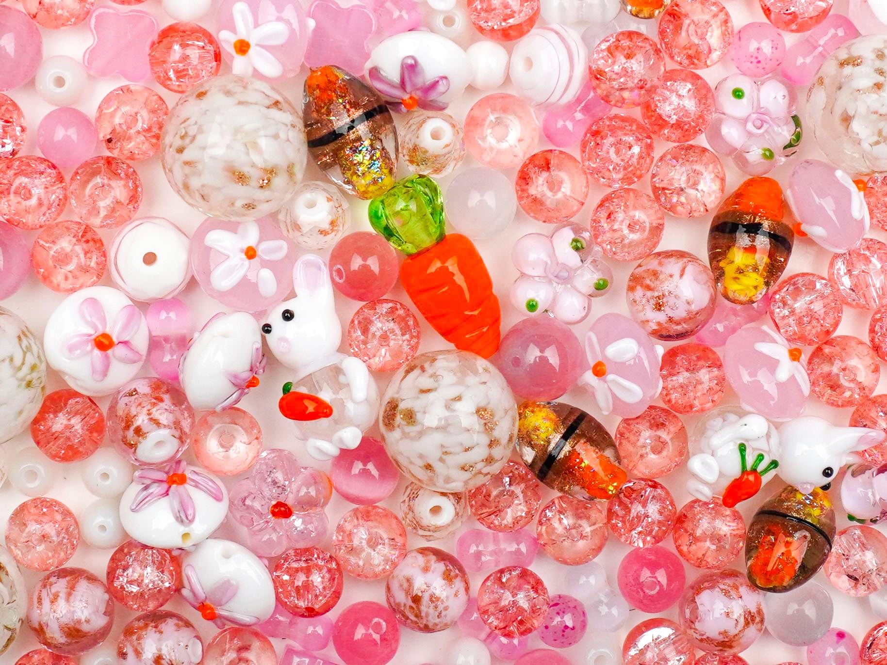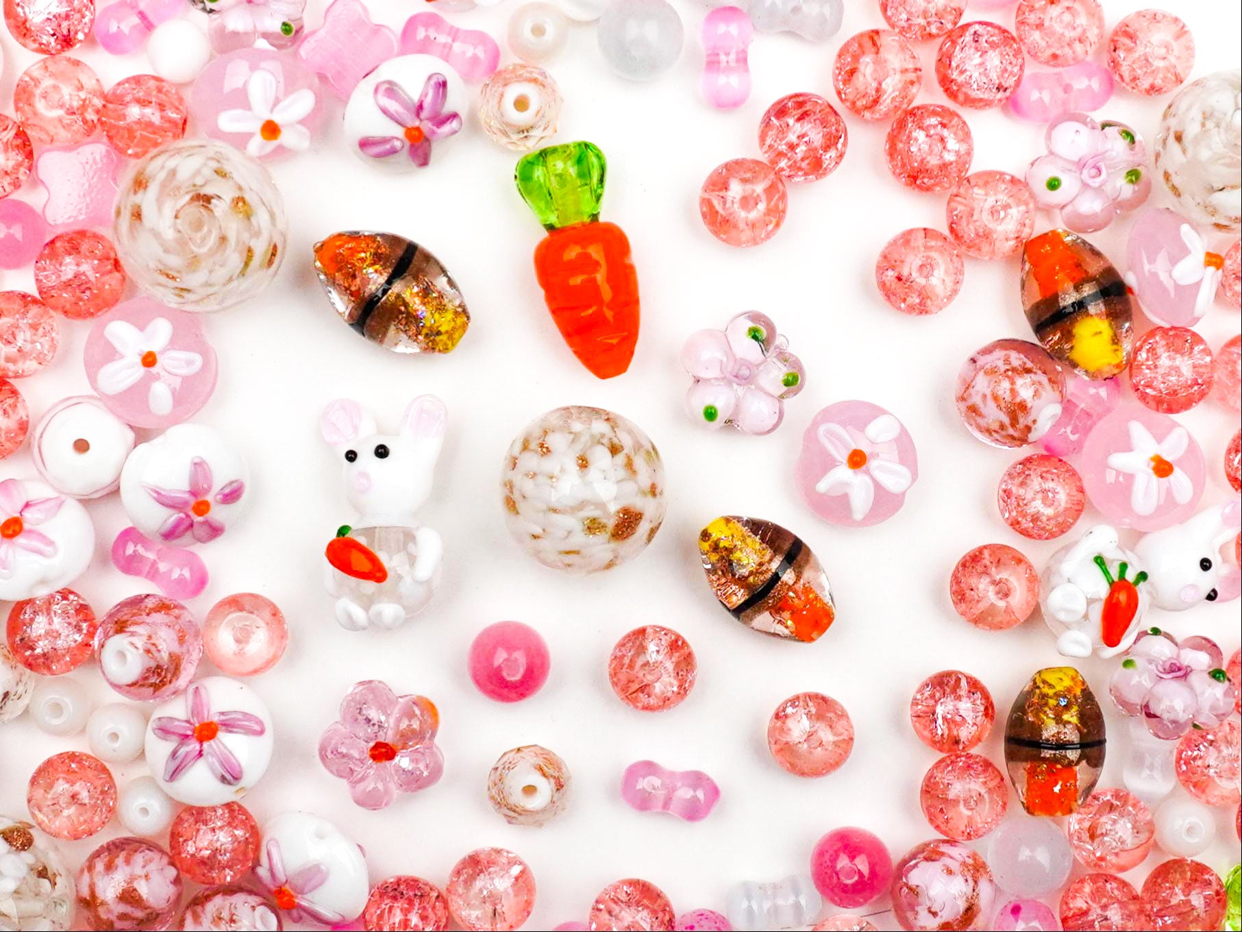 みんな、見て見て〜!😍 大好きなニンジンを一生懸命抱えている姿が愛おしすぎる「もぐもぐバニー」が登場だよ!この一生懸命な表情に、思わず胸キュンしちゃうはず💘。周りには、まるで桜の花びらや甘い砂糖菓子みたいなピンクのビーズをたっぷりと散りばめて、春の「ゆめかわ」全開な世界観に仕上げてみました🌸🍬。