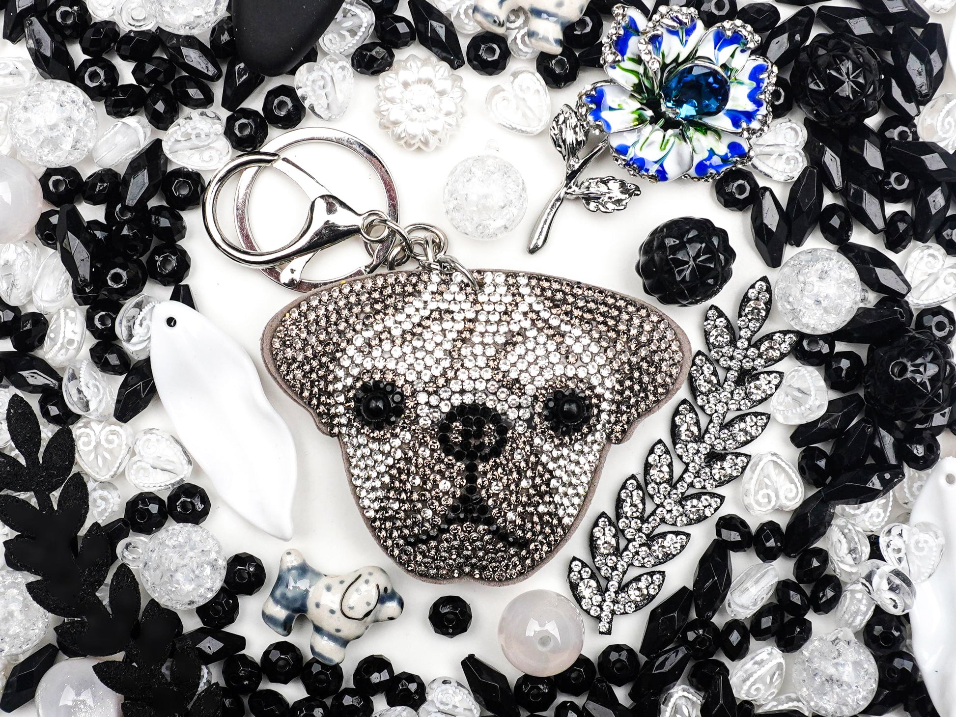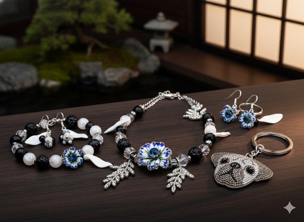 「ねぇ、こっそり夜の冒険に行かない?」そんな声が聞こえてきそうな、ちょっぴりクールで愛おしいセットが完成しました🖤。主役は、星屑のようなラインストーンをまとったキラキラわんこ🐶。その周りに広がるブラックビーズは静かな夜道を、透き通るクラックビーズは夜空に瞬く星たちをイメージしています🌌✨。