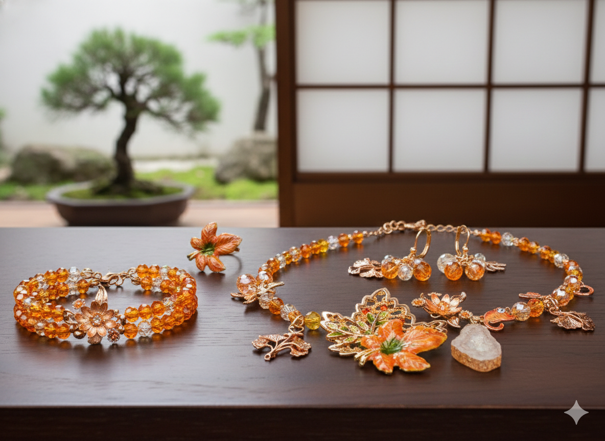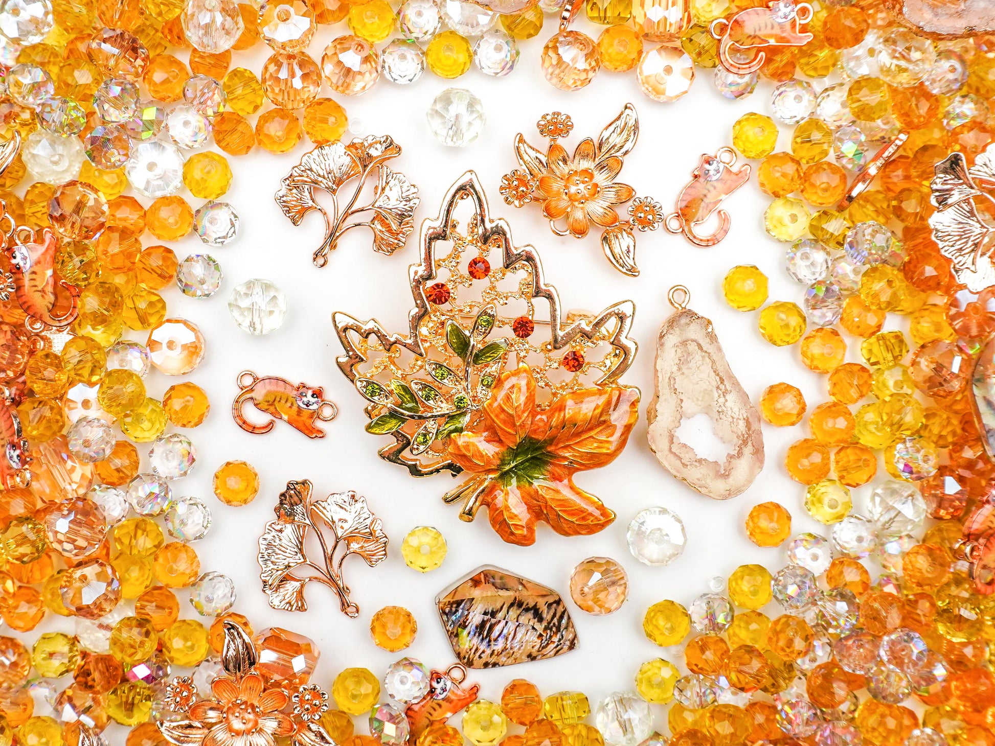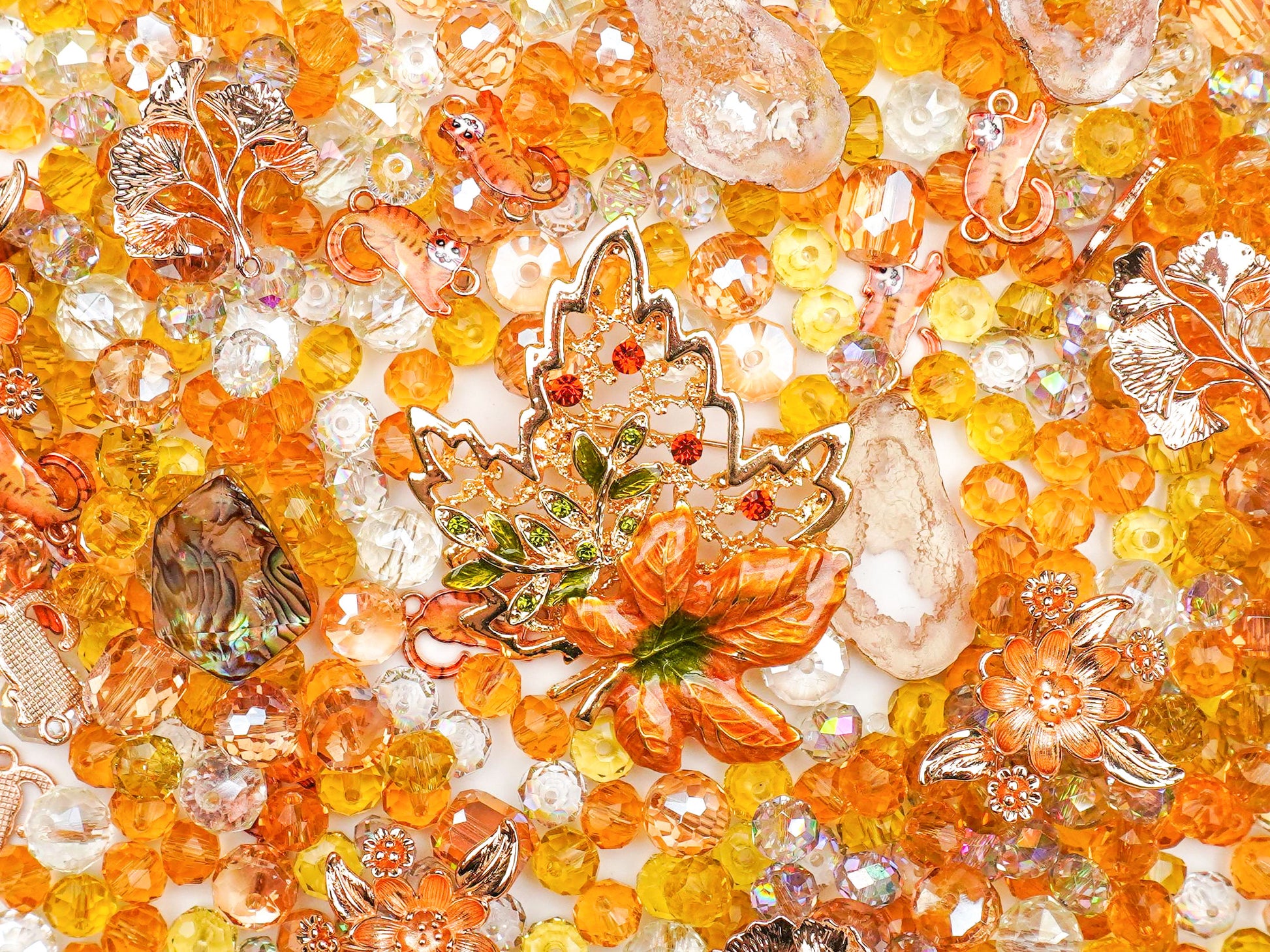 紅葉(もみじ)やイチョウのパーツで季節感を楽しみつつ、よく見ると茶トラ猫ちゃんが隠れてるのが遊び心満載でたまらん...!🐈🍂 キラキラのビーズと天然石風のパーツは、まるで夕日に透かしたハチミツみたいにキラキラして、大人っぽいのにどこか懐かしい「エモさ」が爆発してます🥺