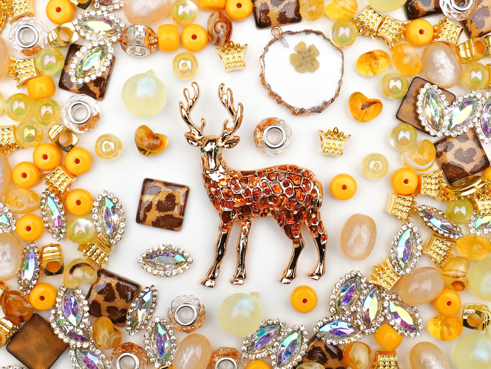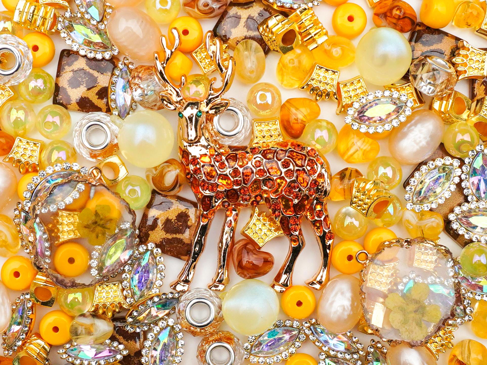 とろけるようなハニーイエローとキャラメルブラウンで統一された配色は、イエベさんにぴったりの「こっくりカラー」🍯。そこに、あえてスパイシーな「レオパード柄」のビーズを混ぜることで、甘すぎない大人の抜け感を演出しました🍂。光に当たるとキラッと光るリーフ型のビーズも幻想的🌿。