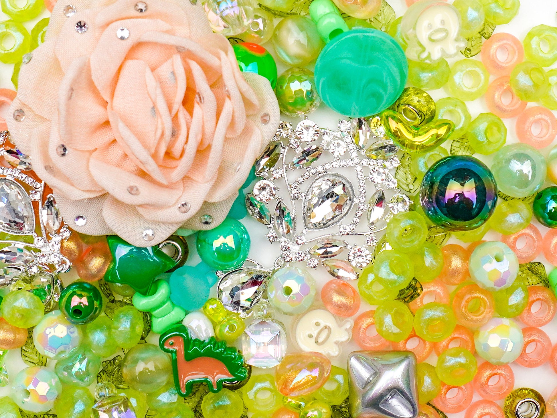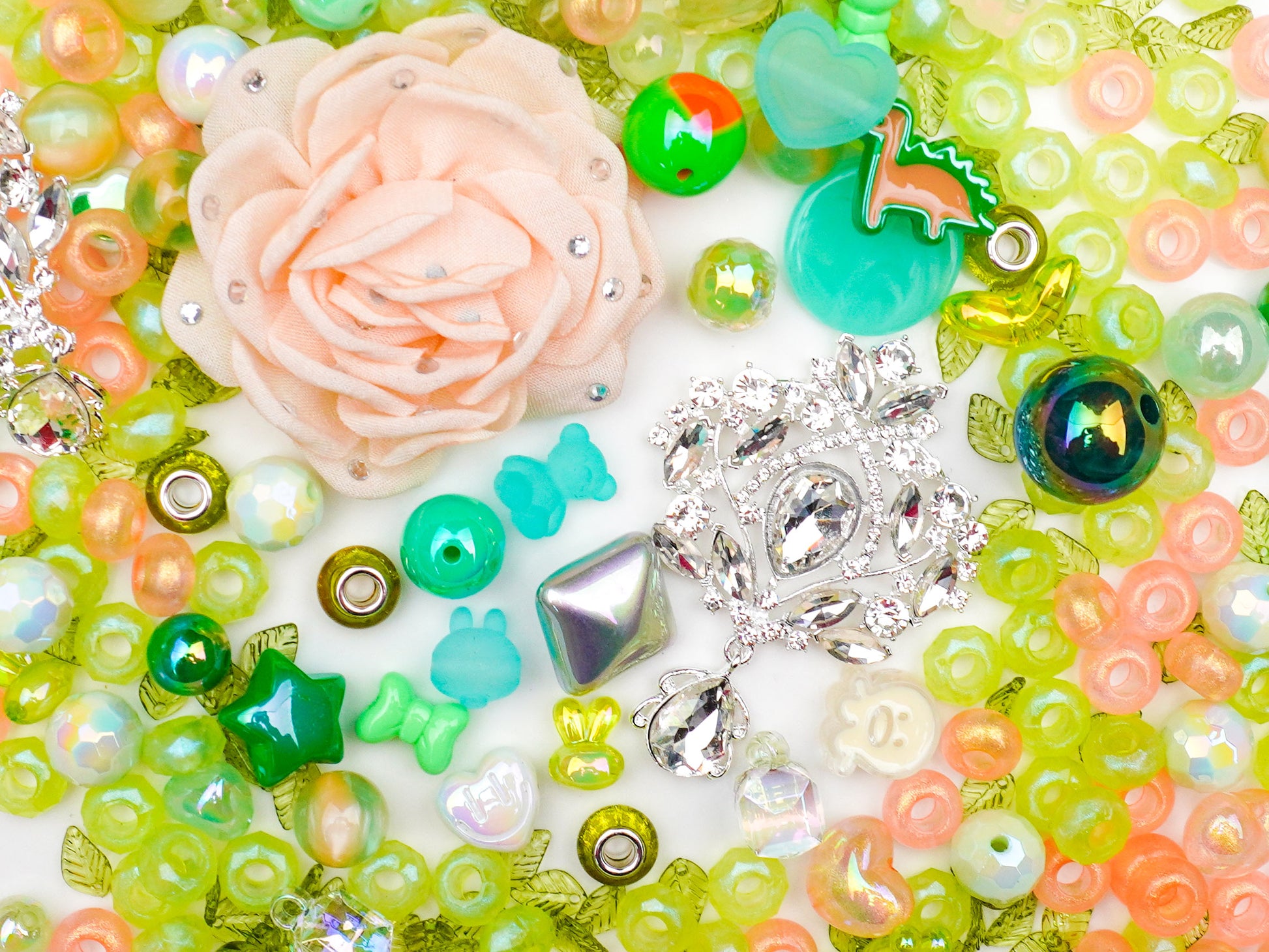 ビーズの中には、星・ハート・リボンなどの形が隠れていて、見る角度によって印象が変わるのも魅力。パステル系なのにしっかり存在感があって、作品づくりがもっと楽しくなること間違いなし🌈💚 ゆるふわガーリーにもナチュラルにも使える万能カラーです!