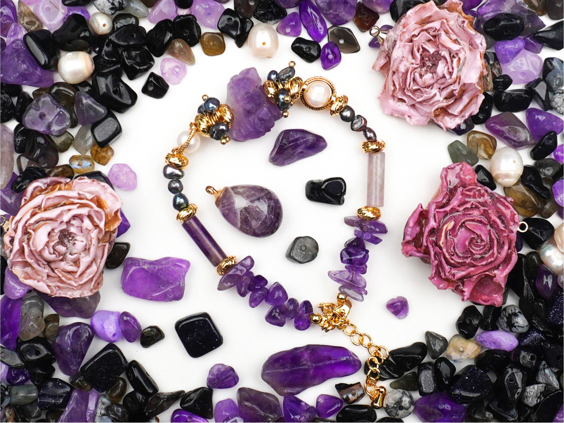 自分の中に眠る魔法を呼び覚ます「魅惑のアンティーク」へようこそ!💜 深みのあるパープル天然石とゴールドが溶け合うこのブレスレットは、身につけるだけで「特別な私」になれる、まさに主役級のお守りアイテムです。✨ どこか懐かしくて新しいヴィンテージな雰囲気が、いつものコーデをグッと大人っぽく、ドラマチックに格上げしてくれるよ。💍