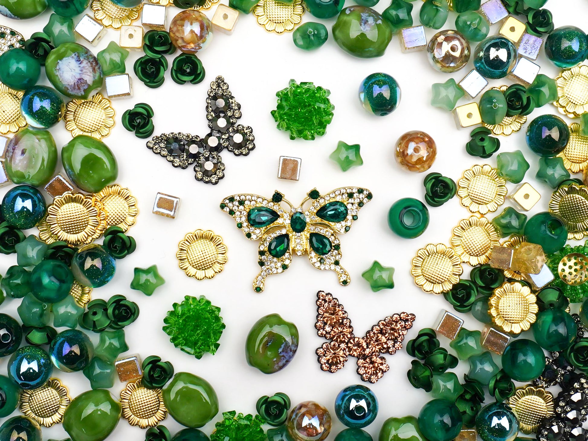 日常にマイナスイオンをチャージ🌿 都会の喧騒を忘れて、自分だけの「秘密の花園」をハンドメイドしてみませんか? 鮮やかなグリーンと上品なゴールドの組み合わせは、今のトレンドでもある「ナチュラル可愛い」スタイルにぴったり。キラキラ輝く蝶々のチャームを主役に、ひまわりのパーツを自由に散りばめれば、手元を見るたびに心がホッと癒されるはずです✨