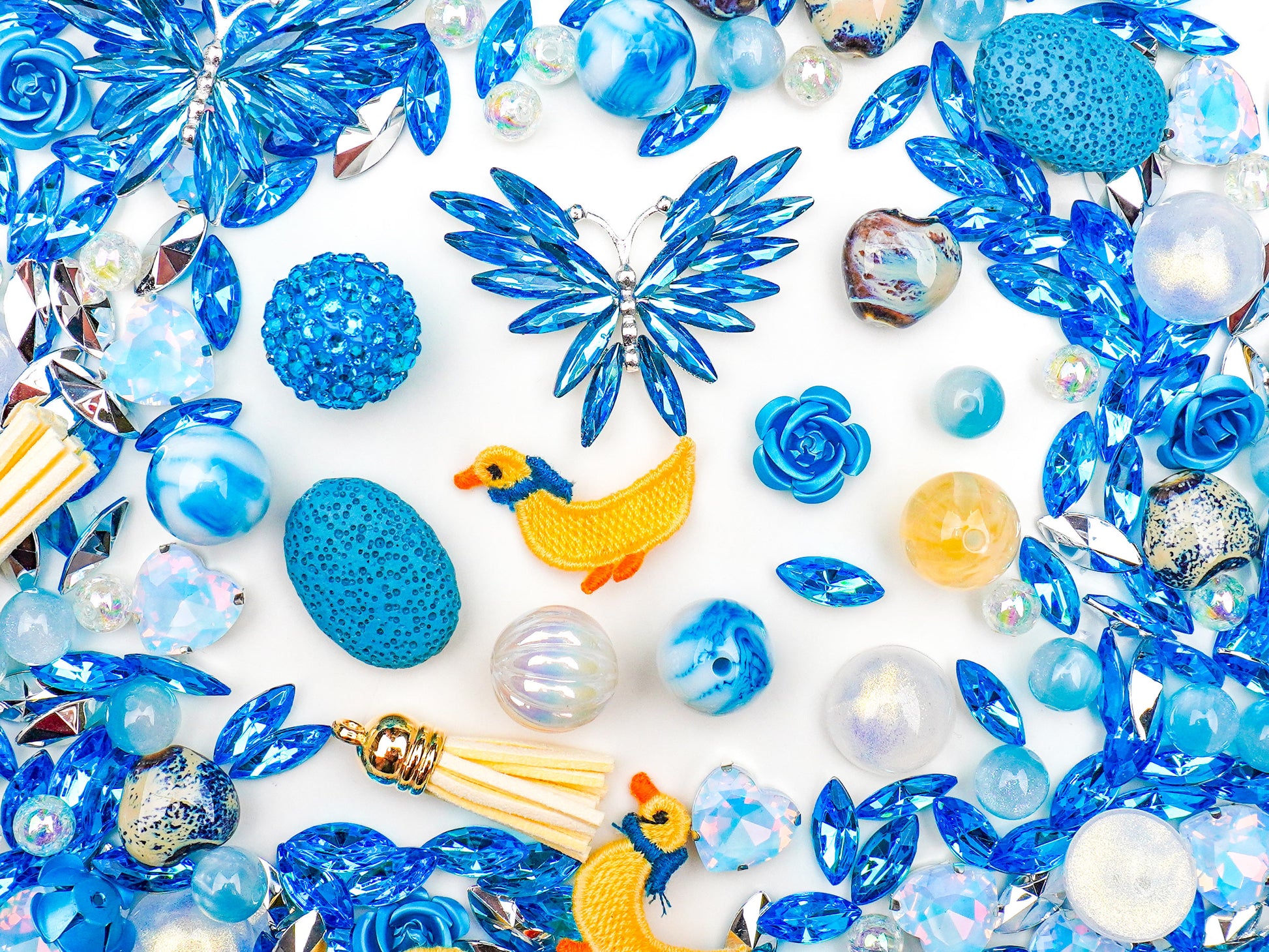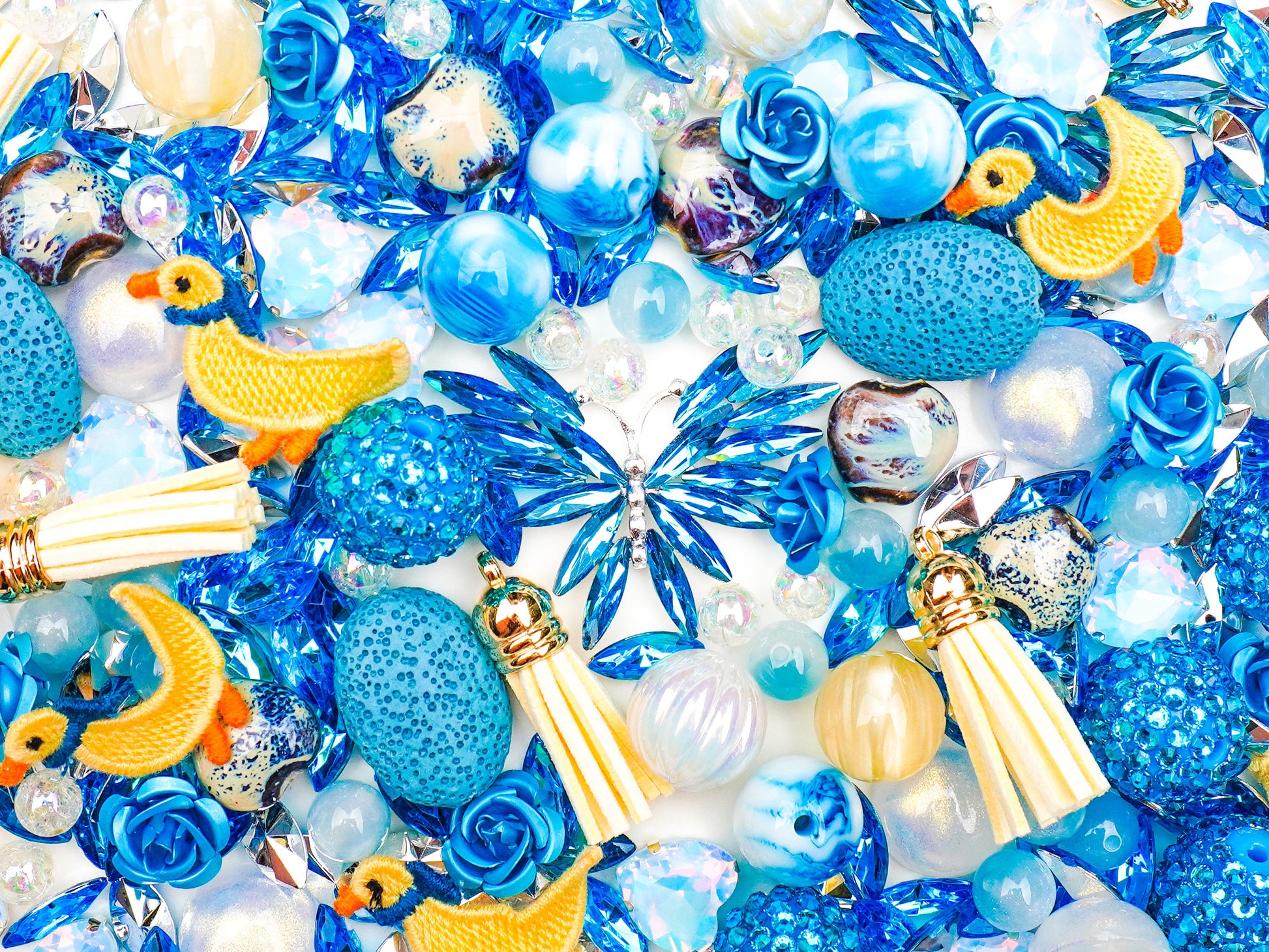 青い海のようにキラキラ輝くビーズたちがぎっしり詰まった「すいへいさんぽ」。ブルーを基調にした透明感のあるパーツに、可愛いアヒルのモチーフやお花型のチャームがアクセントになっていて、見ているだけで心がほっと癒されます。💙🐤