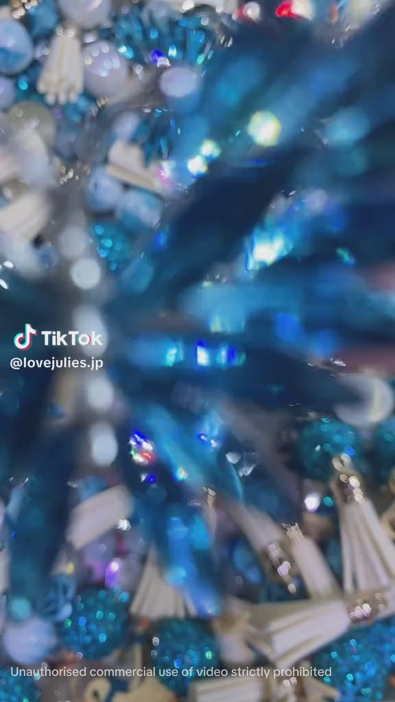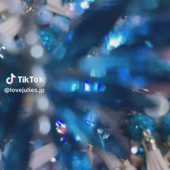 大粒のビーズやラメ入りのキラキラパーツは、光に当たると海の波のようにきらめき、夏の爽やかさを演出。さらにシルバーのリーフ型パーツや立体的なローズモチーフが加わることで、大人っぽさと可愛さを両立させたスタイルに仕上がっています。🌹🌟