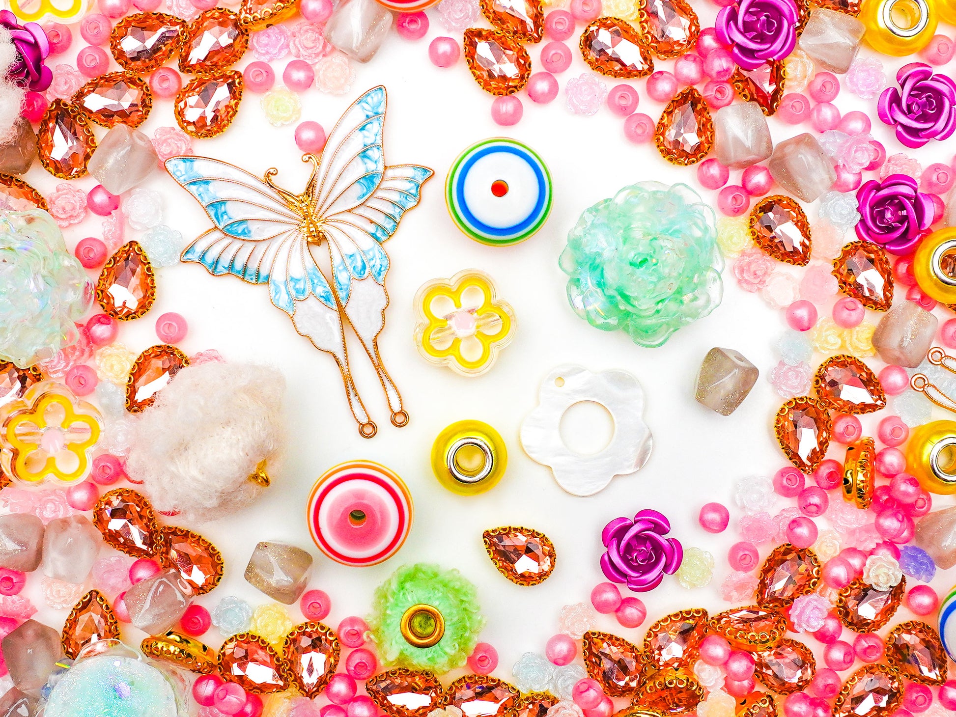 ポイントは、元気なビタミンカラーとガーリーなピンクやグリーンの組み合わせ🍭🌼。キラキラ光るビーズや立体感のあるお花モチーフが、いつものアクセ作りにとびきりの華やかさをプラスしてくれます。ハンドメイドするたびに「今日はどんなフェス気分で作ろう?」って考えるのも楽しい✨。
