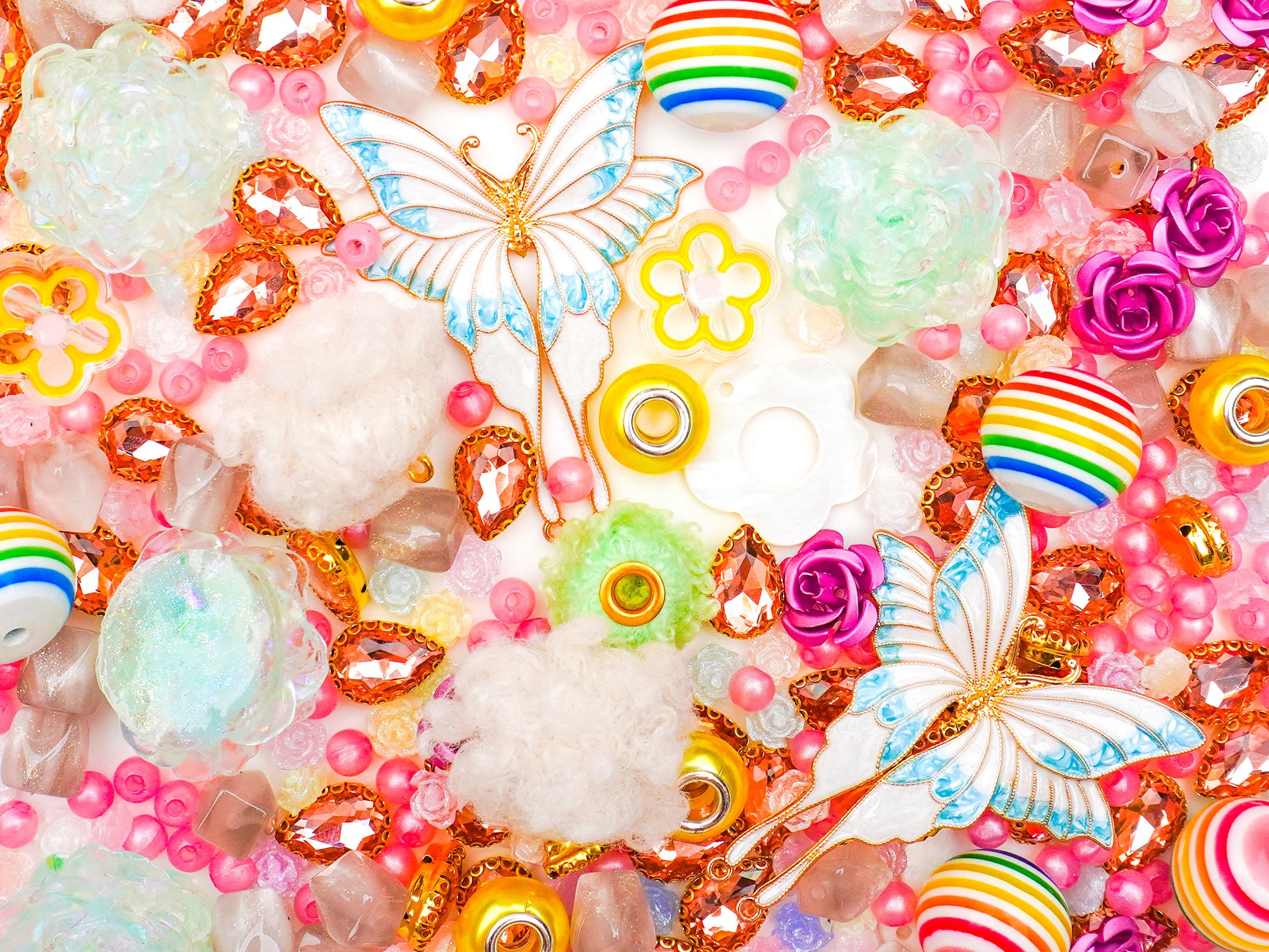 鮮やかなオレンジやピンクのビーズに加えて、可愛いお花のモチーフやきらめくバタフライチャームがアクセントになり、見ているだけでワクワクする気分に💖。まるでフェスの屋台やパレードを連想させるような、楽しい雰囲気いっぱいのデザインです。