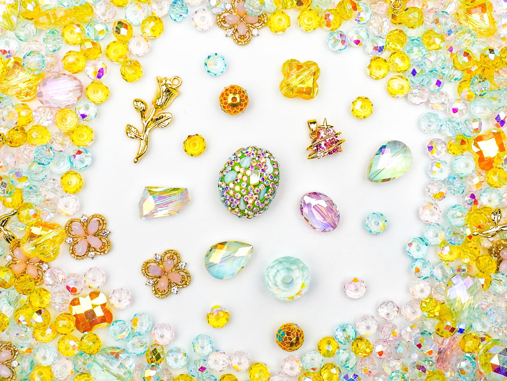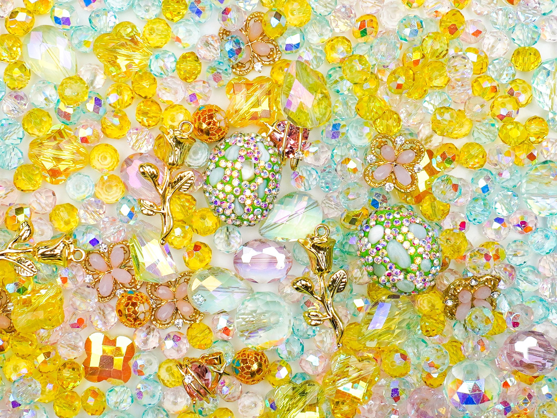 “ひかりのきいろ”は、太陽の光をぎゅっと閉じ込めたような、あたたかくてキラキラのビーズを集めたハッピーミックス☀️💛 まぶしいイエロー×やさしいミントブルー、そして淡いピンクの組み合わせがまるで“春の午後のひだまり”みたいに心をふんわり包み込んでくれます。中央にはお花のように輝く大粒チャームや虹色に光るドロップビーズが並び、見るだけで元気がわいてくる世界観です🌼✨