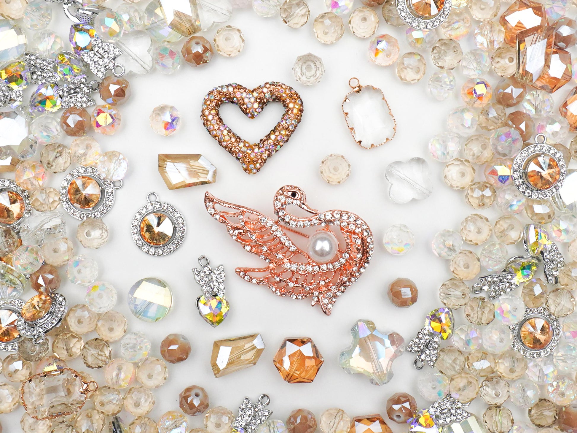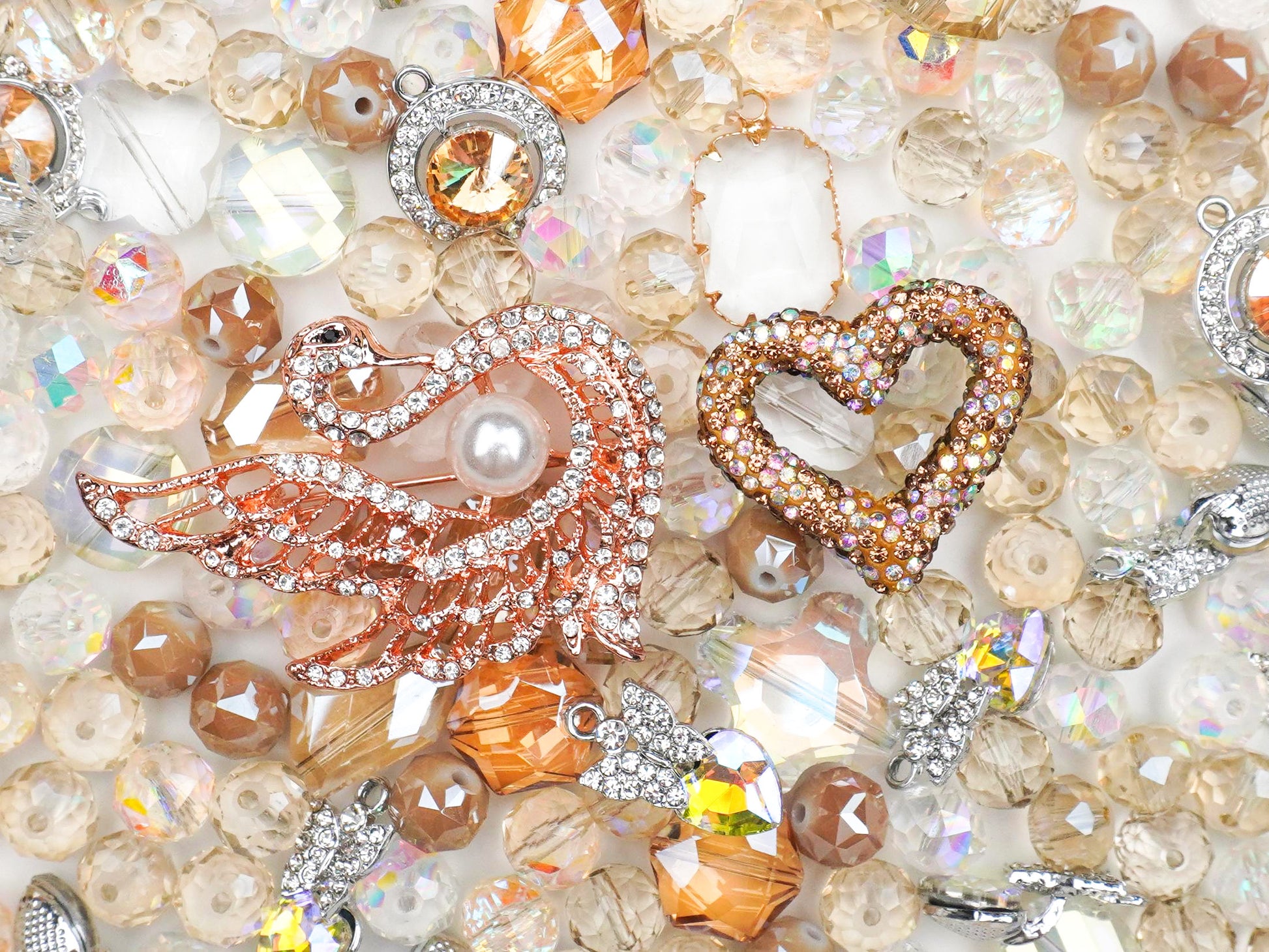 主役は、パールを抱いた気品あふれるスワン(白鳥)のチャーム👑。周りには、ヴィンテージライクなハートや、香水瓶のようなクリアジュエルが散りばめられていて、光に当たるたびに繊細で高級感のある輝きを放ちます💎。トレンドの「バレエコア」や「淡色コーデ」にもドンピシャ!🩰