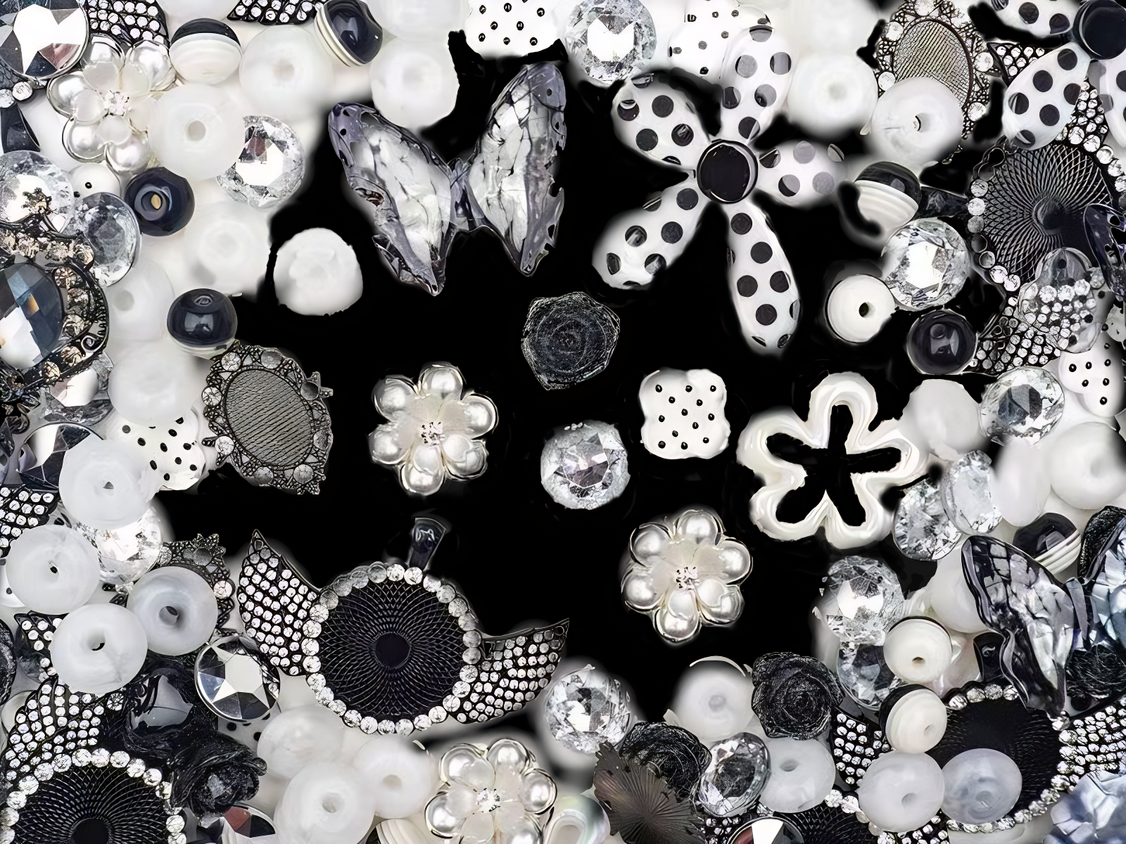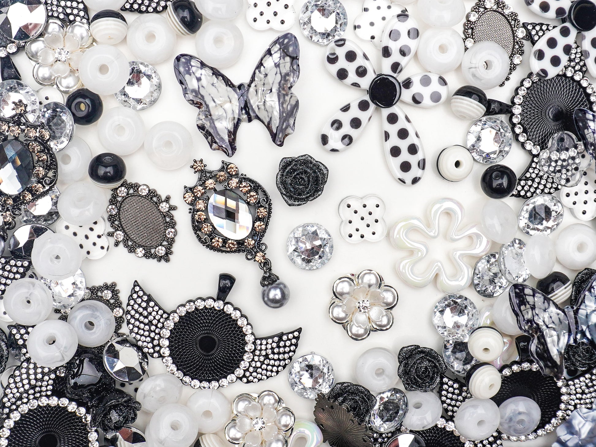 上品でモードな「モノトーンリリー」は、黒と白の世界に咲くリリーのように美しく、凛とした魅力を放つセットです✨。ドット柄のフラワーパーツや、マーブル模様の蝶チャーム、そしてクリスタルの輝きが織りなす洗練されたコントラストがポイント。まるでパリの街角を歩くようなシックな雰囲気を楽しめます🇫🇷🌹。