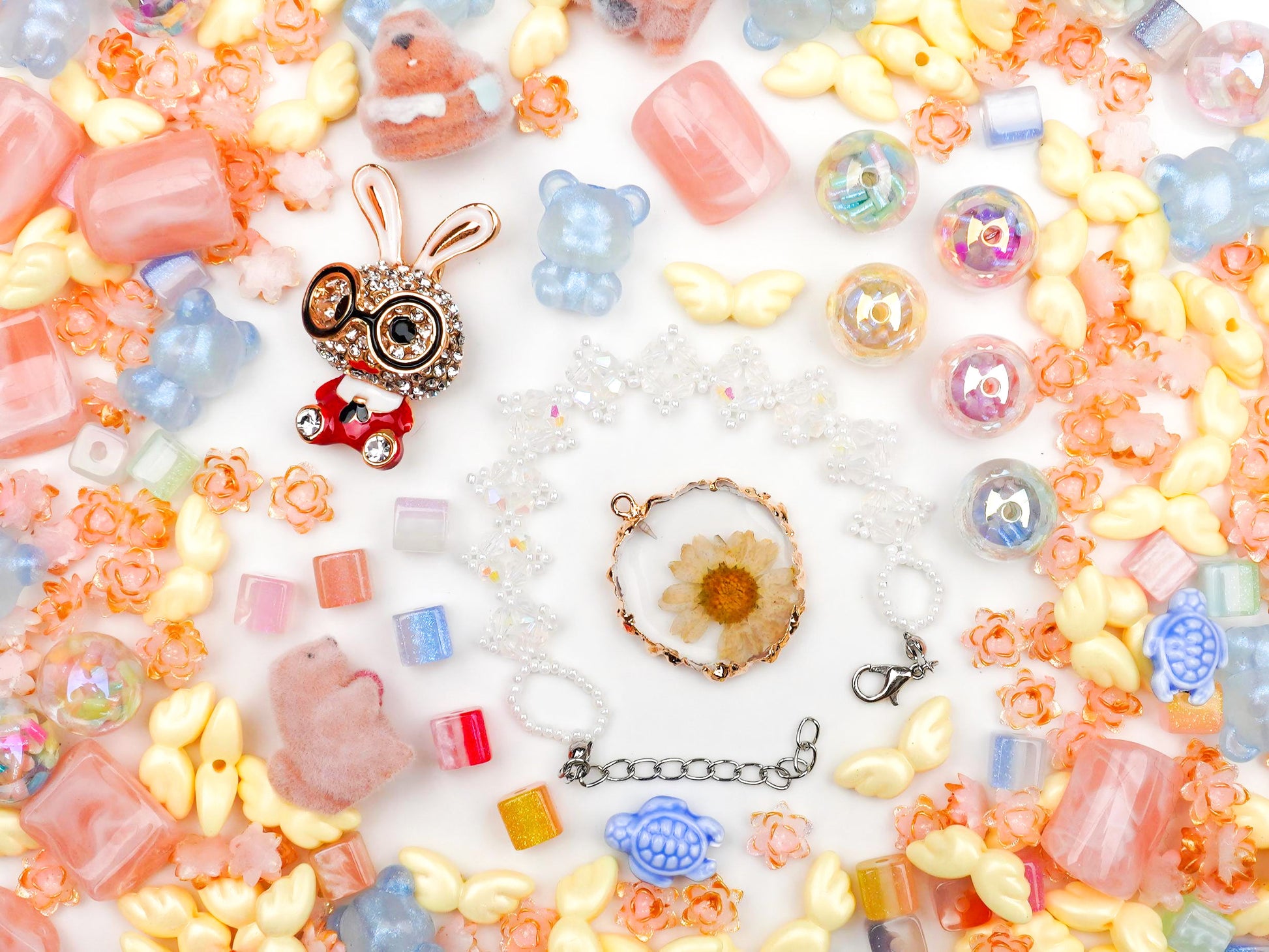 主役はなんといっても、大きな丸メガネをかけたキュートなうさぎちゃん🐰👓と、思わず触りたくなるふわふわのフロッキーベア🧸!真ん中には本物のお花を閉じ込めたチャームも咲き誇り、グミのようなビーズと一緒に詰め込むことで、まるでお菓子のバスケットのような可愛さを実現しました🍬。