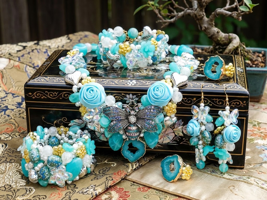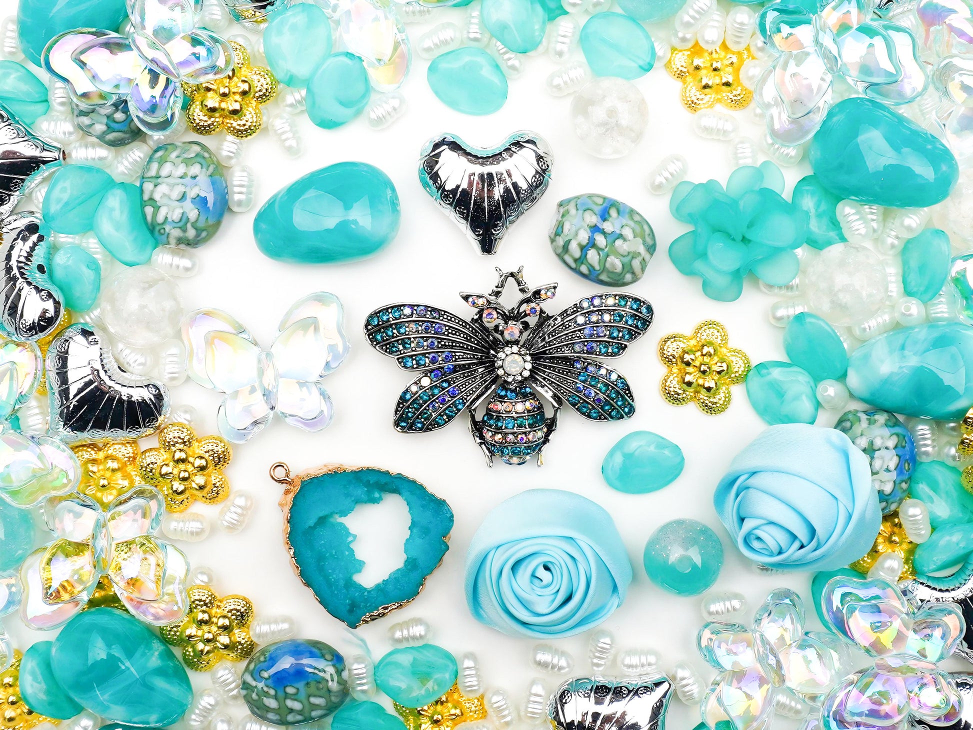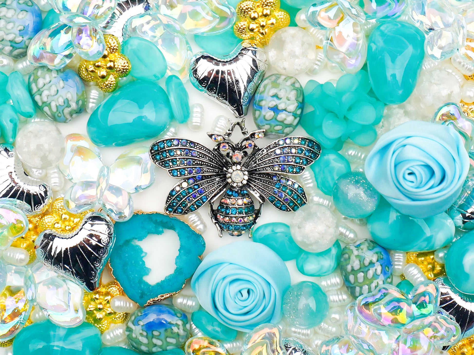 シュワっと弾けるあの夏の記憶を閉じ込めた、**「初恋ラムネ」**コレクションが登場!爽やかなミントグリーンとソーダブルーを基調に、まるで瓶の中のビー玉のような透明感あふれるビーズをたっぷり詰め込みました。中央で輝く大ぶりのミツバチチャームは、繊細なストーンが敷き詰められた主役級の存在感。シルキーなバラやオーロラのバタフライを組み合わせれば、甘酸っぱくてキラキラした、あなただけの「初恋」が形になります✨。