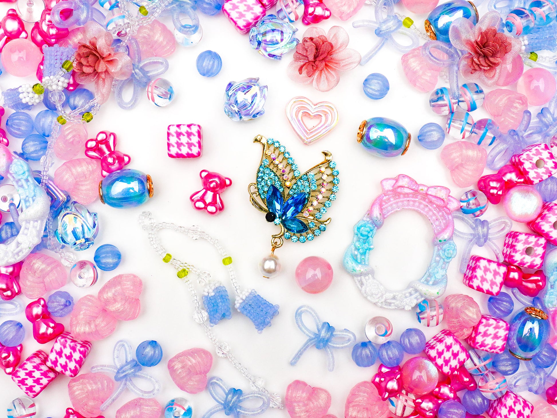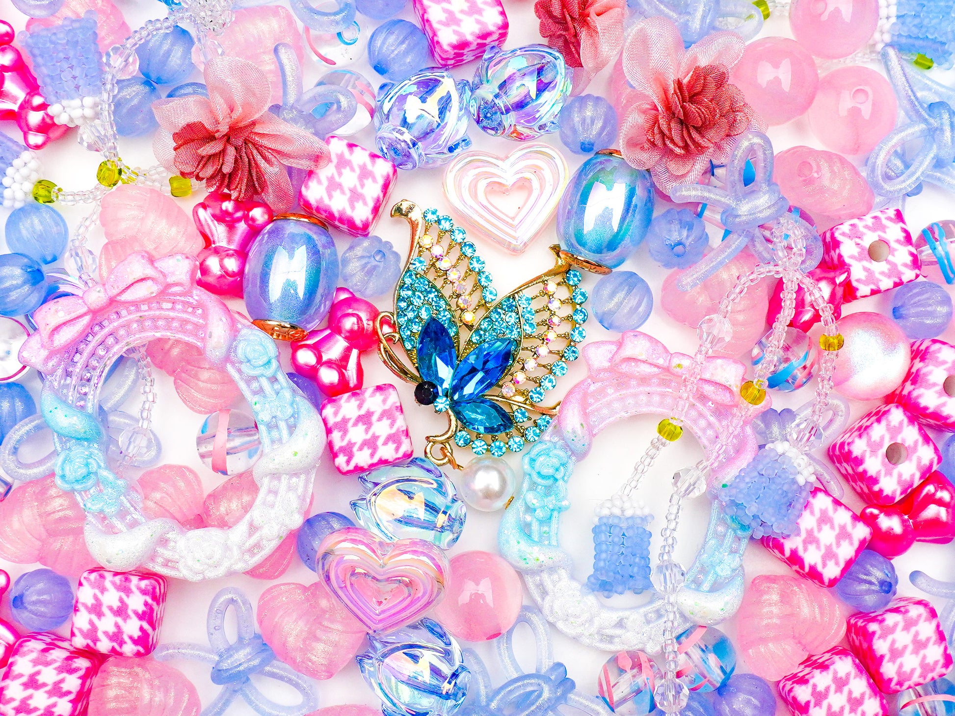 淡いピンク、ベビーブルー、ミントのキャンディカラーに、きらきら光るビジューの蝶やふわふわのお花ビーズ、リボンやテディベアまで詰め込んだ、夢かわ全開のスペシャルミックス!🧚♀️💖