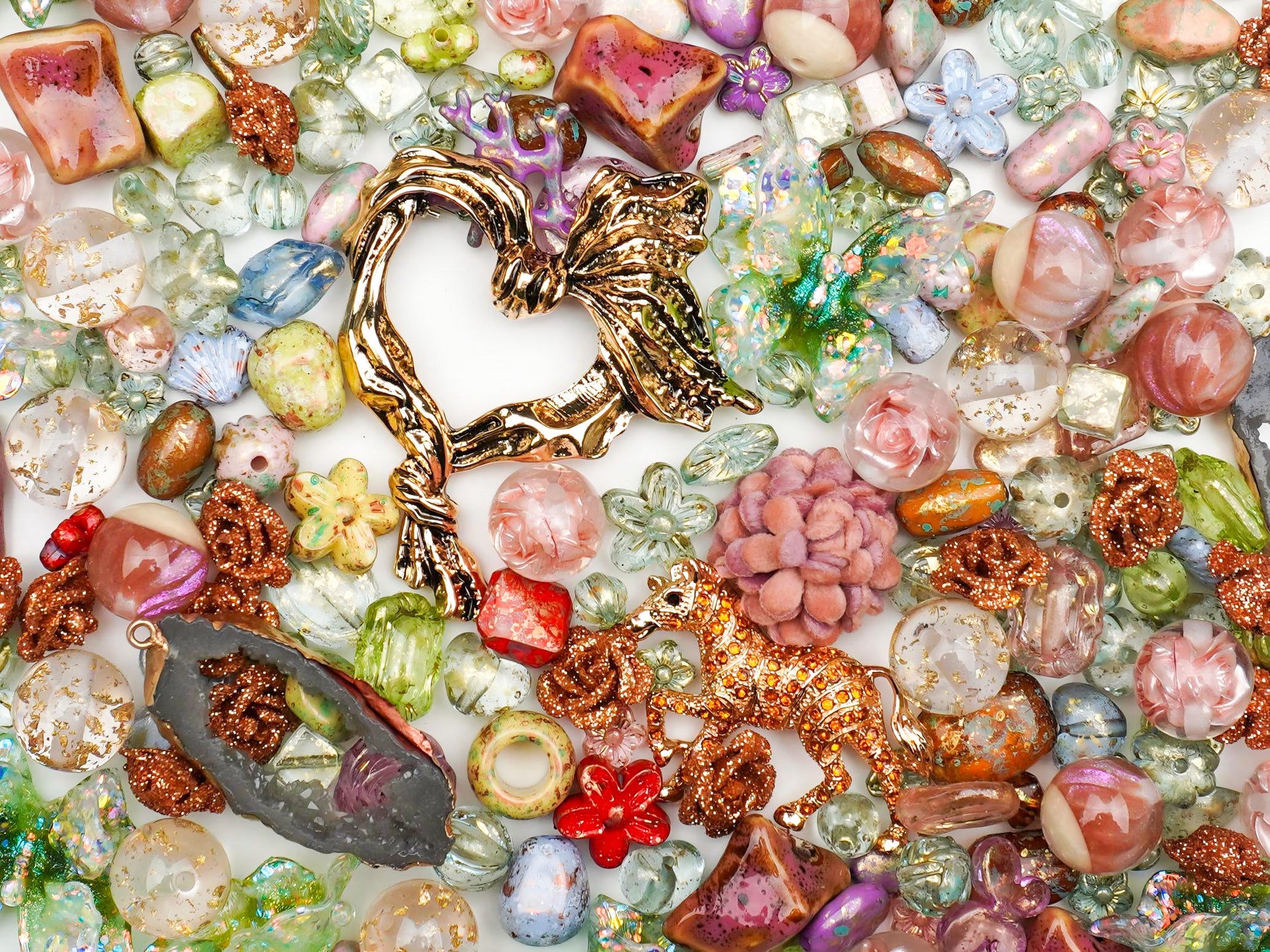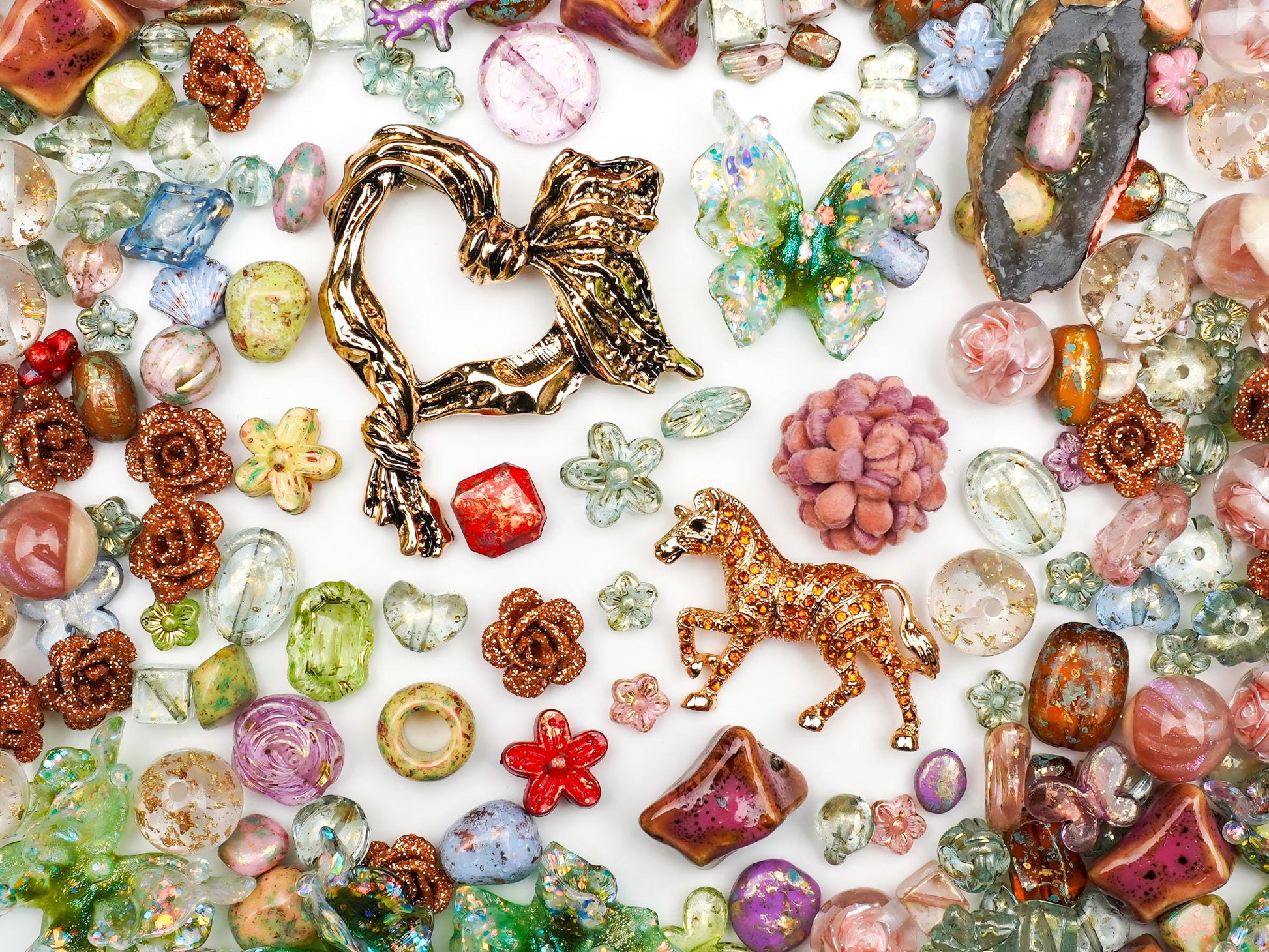 夕暮れ時の秘密の森で交わした誓い…。そんなロマンチックなストーリーを形にした**「金色の約束」**コレクションが登場しました。温かみのあるゴールドのホースチャームや流線形のハートを主役に、琥珀色やピスタチオグリーンのヴィンテージ風ビーズを贅沢にミックス。キラキラ輝くオーロラバタフライや、まるで金箔を閉じ込めたような天然石風パーツが、あなたの手元をアーティスティックで華やかに彩ります。✨🐎