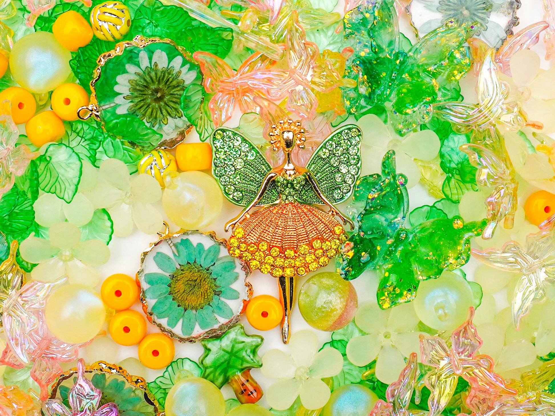 まるで絵本の世界から飛び出したみたい!🧚♀️✨ 新作「妖精の隠れ家」は、ジューシーなライムグリーンとビタミンイエローが弾ける、元気いっぱいのミックスです💚🍋 森の奥でこっそり遊ぶ妖精さんのブローチを主役に、本物のお花を閉じ込めたチャームや、ひらひら舞うオーロラ蝶々を詰め込みました🦋🌿