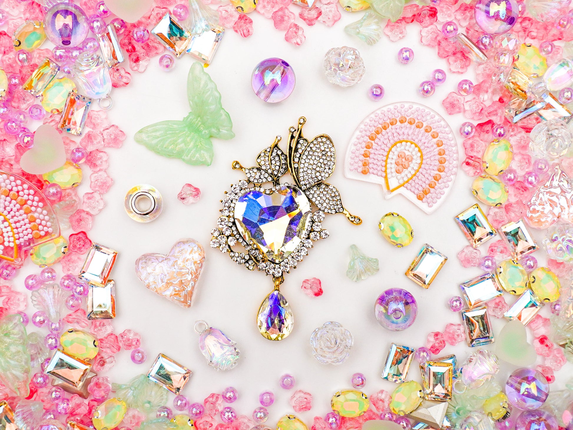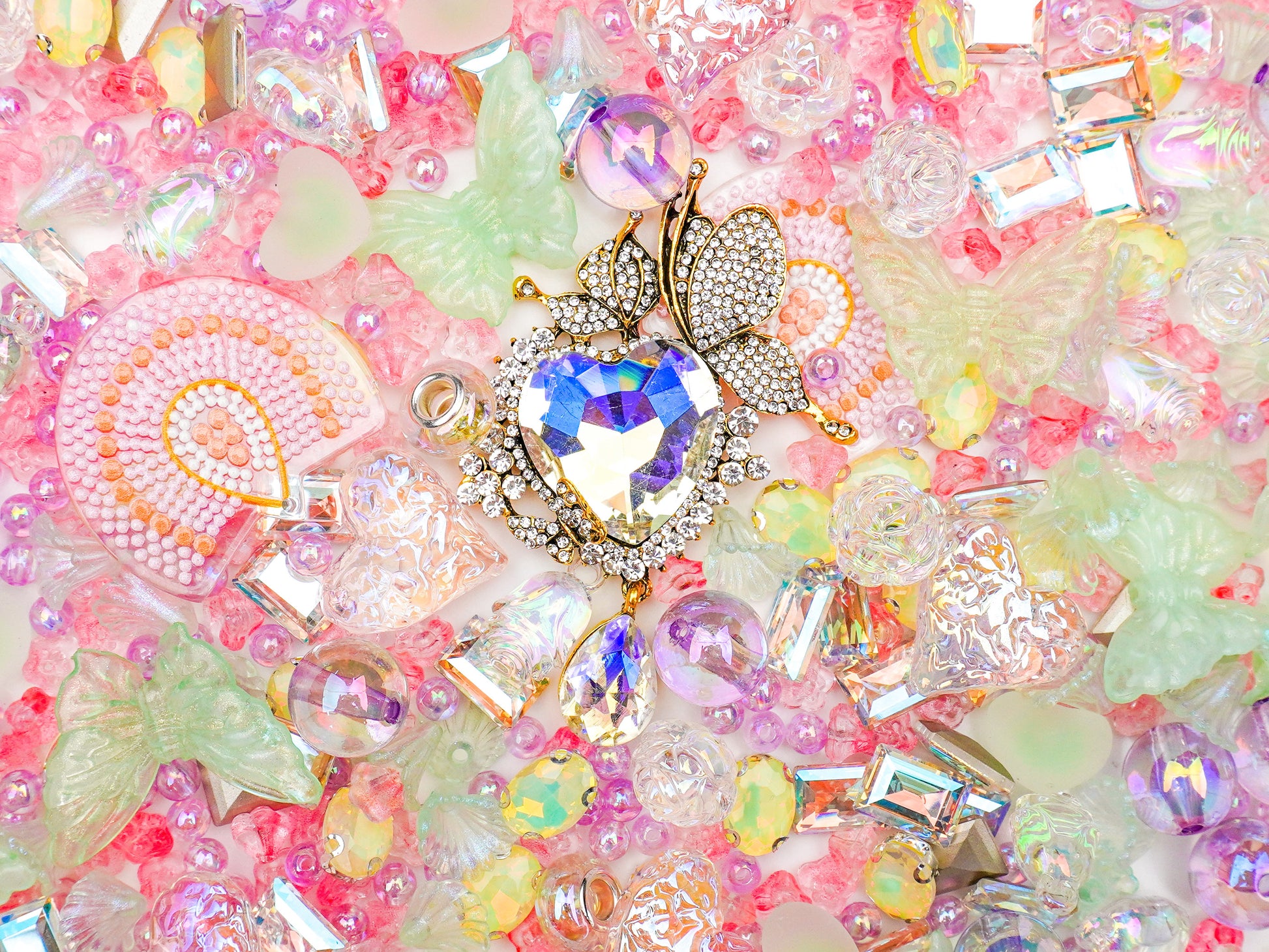 キャンディみたいに透きとおるハート、シュワっとした泡のようなビーズ、ミルキーパステルの蝶々や虹モチーフ…まるで甘いお菓子箱を開けたみたいな、夢かわカラーがぎっしり詰まっています🍭💕