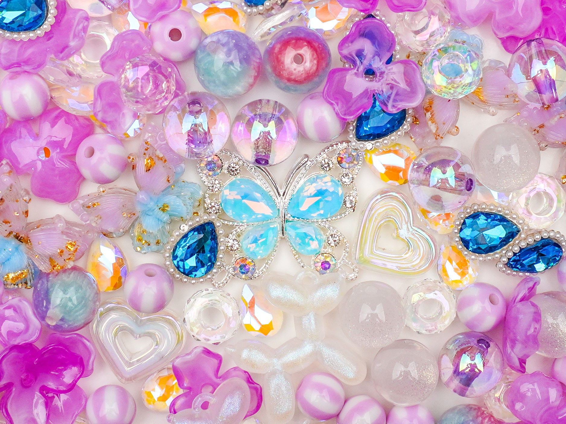 淡いパステル×オーロラの組み合わせは、ふわっと夢の世界へ連れていってくれる魔法のカラー。ハートのチャームやころんとしたビーズも多く、どこを使っても“かわいい”が完成する幸せセットです💞 アクセサリーを作る手元まで柔らかく輝いて、まさにフェアリー気分が楽しめます🌈🦋