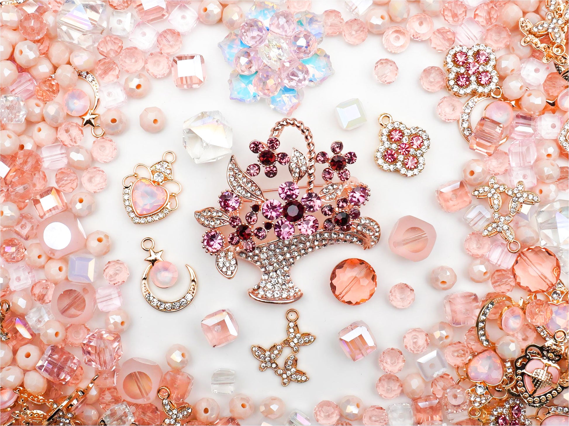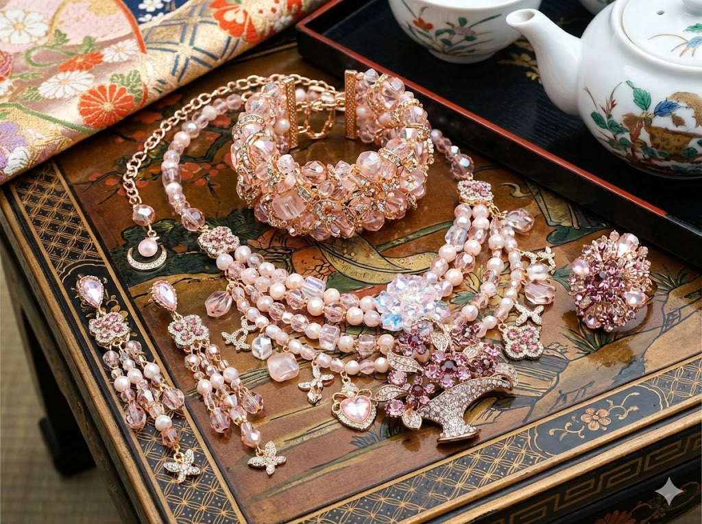 夜空にそっと願う、あなただけの特別なストーリー。新作**「三日月の願い」**は、甘いピーチピンクと透き通るようなクリスタルを組み合わせた、最高にロマンチックなコレクションです。主役のきらめくフラワーバスケットや、夜空に浮かぶ三日月のチャームを繋げば、まるで魔法が解けないお守りのような、自分だけの「願い」が形になります💖。