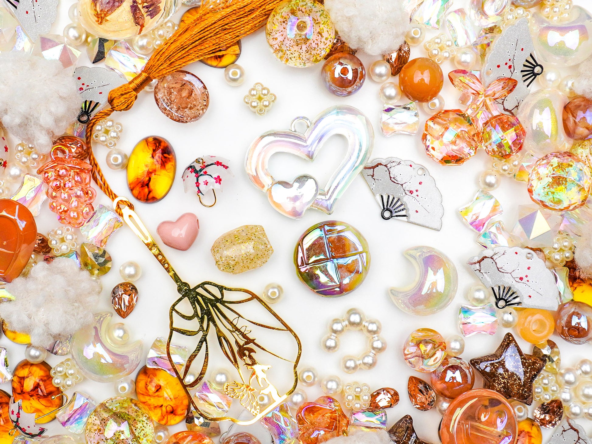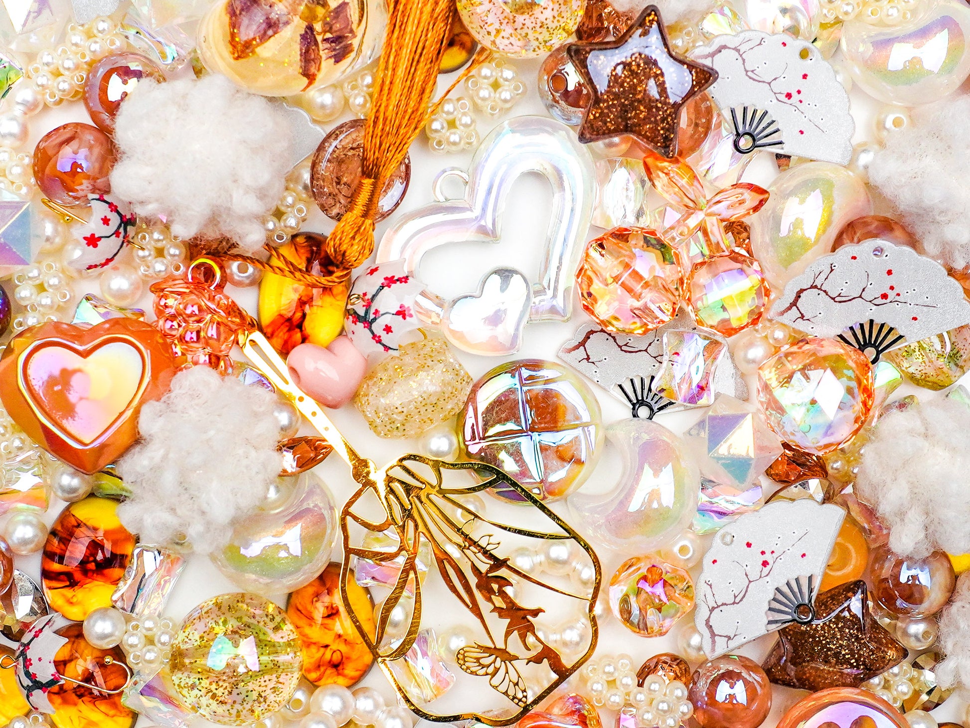「琥珀のきらめき」は、幻想的な色合いと優しい輝きが魅力のミックス。パールやハート、扇子モチーフが上品にきらめき、見るだけで癒される世界観🍯🧡。