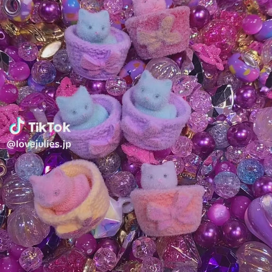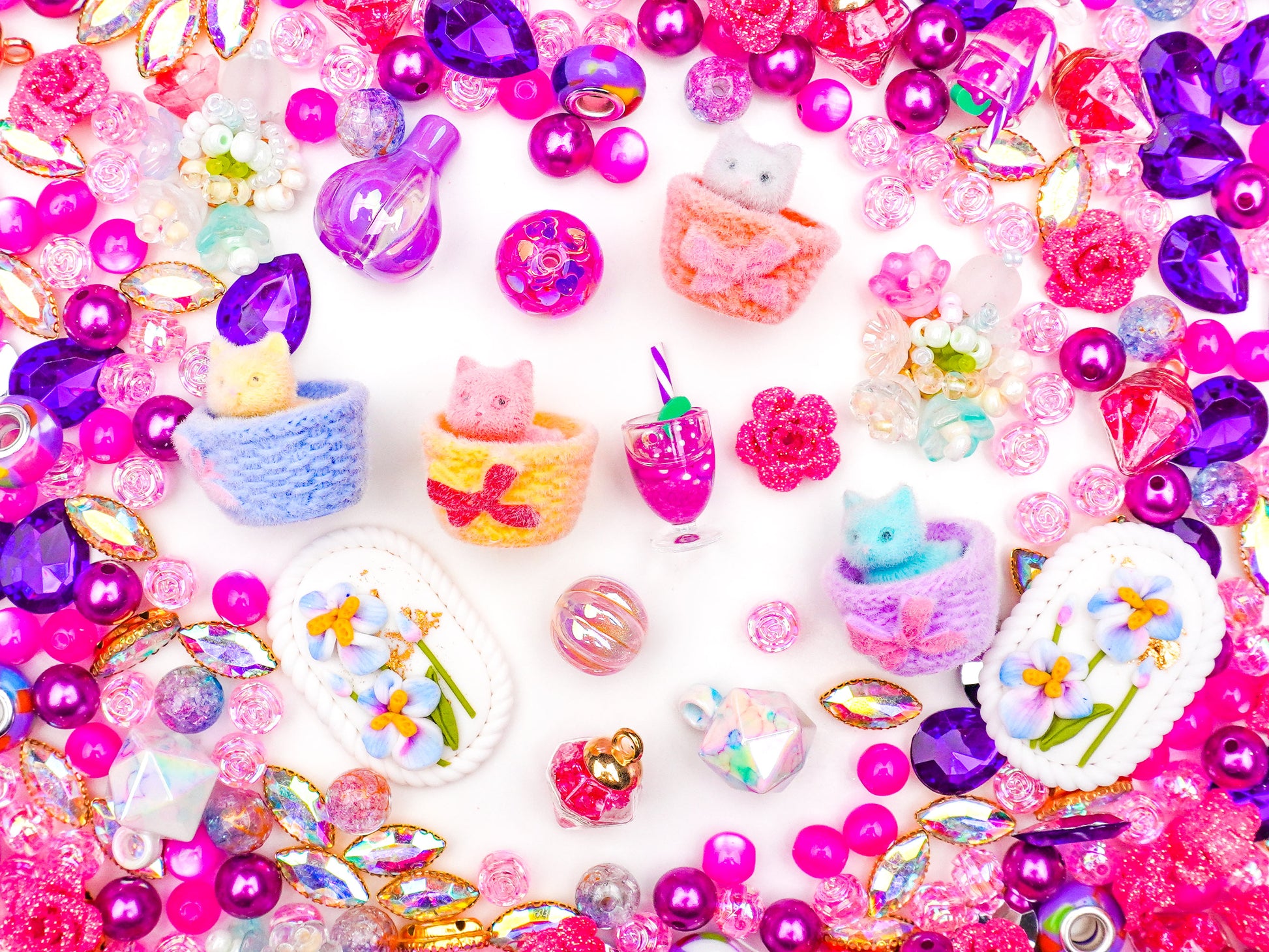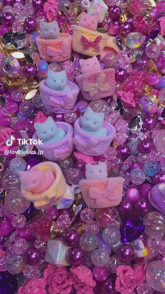 「ねことお花やさん」は、ピンク・パープル・ミントブルーを中心にした、とびきりキュートなカラーがいっぱいの夢かわミックス💖。編みカゴにちょこんと入ったねこちゃんや、花びらモチーフ、キラキラのビーズが並んでまるで春のマルシェのよう🌷。