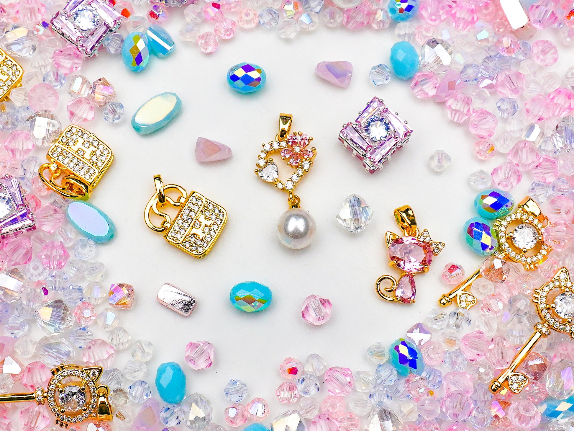 ゴールドパーツには細かなストーンがきらめき、まるで小さなジュエリーみたい💍✨ ビーズの透明感やオーロラカラーの輝きが加わることで、光が当たるたびにふわっと色が変わり、作品全体に魔法みたいなかわいさがプラスされます。ひと粒使うだけで、作品が“ひみつの物語”を語り出すようなデザインに。