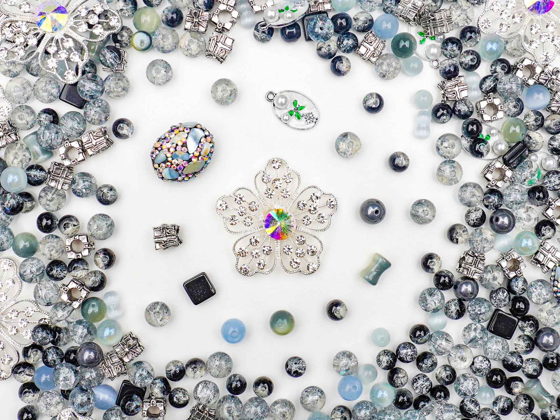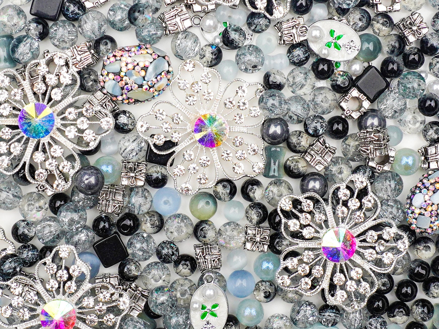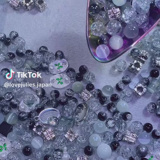 やわらかいグレーの世界に、そっときらめく光を散りばめた“ほのかグレーガール”が登場🤍✨ 全体はスモーキーグレー、シルバー、淡いブルーを中心にした大人かわいい色合いで、まるで朝の霧の中に差しこむ光のような上品な雰囲気。ひとつひとつ異なる模様のガラスビーズや、オーロラに輝くフラワーモチーフがアクセの主役になってくれます。