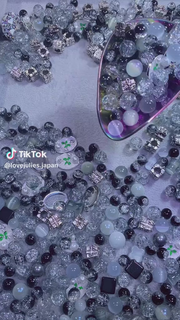 シルバーのミニチャームがアクセントになり、クールさとかわいさを絶妙にミックス🌫️✨ グレーの透明ビーズは光が当たるたびに深みが変わり、静かだけど存在感のある“おしゃれグレー”を楽しめるのがポイント。大人っぽいけど重すぎず、ナチュラルに使える万能カラーが詰まっているので、普段使いアクセにもぴったりです。