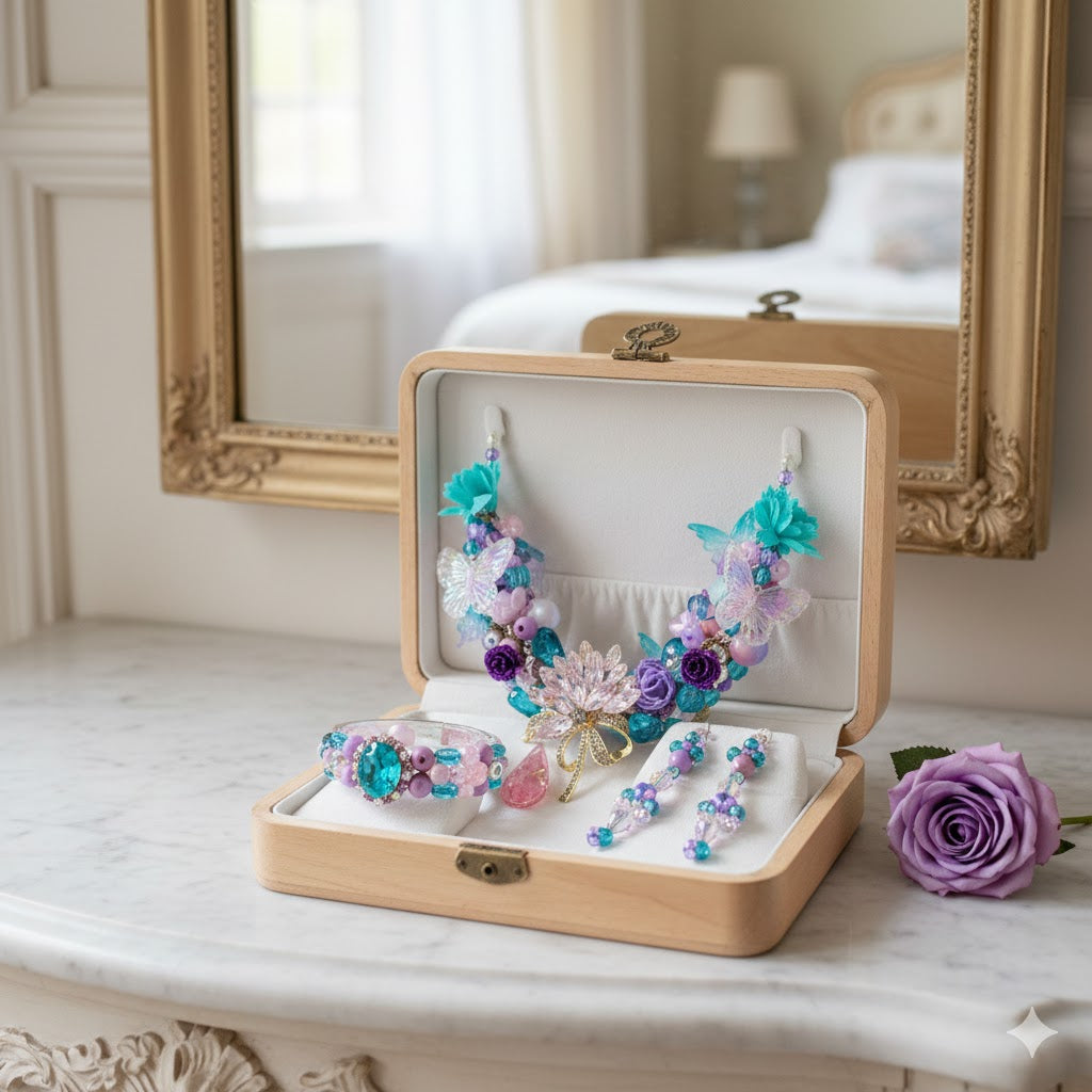 周りには、蝶々や花びら、ハートモチーフがちりばめられ、光を浴びるたびにキラキラと輝く💎🦋 柔らかいパステルカラーに、ところどころ差し色のブルーが加わり、全体がバランスよくまとまった“ゆめかわ×エレガント”な印象に。