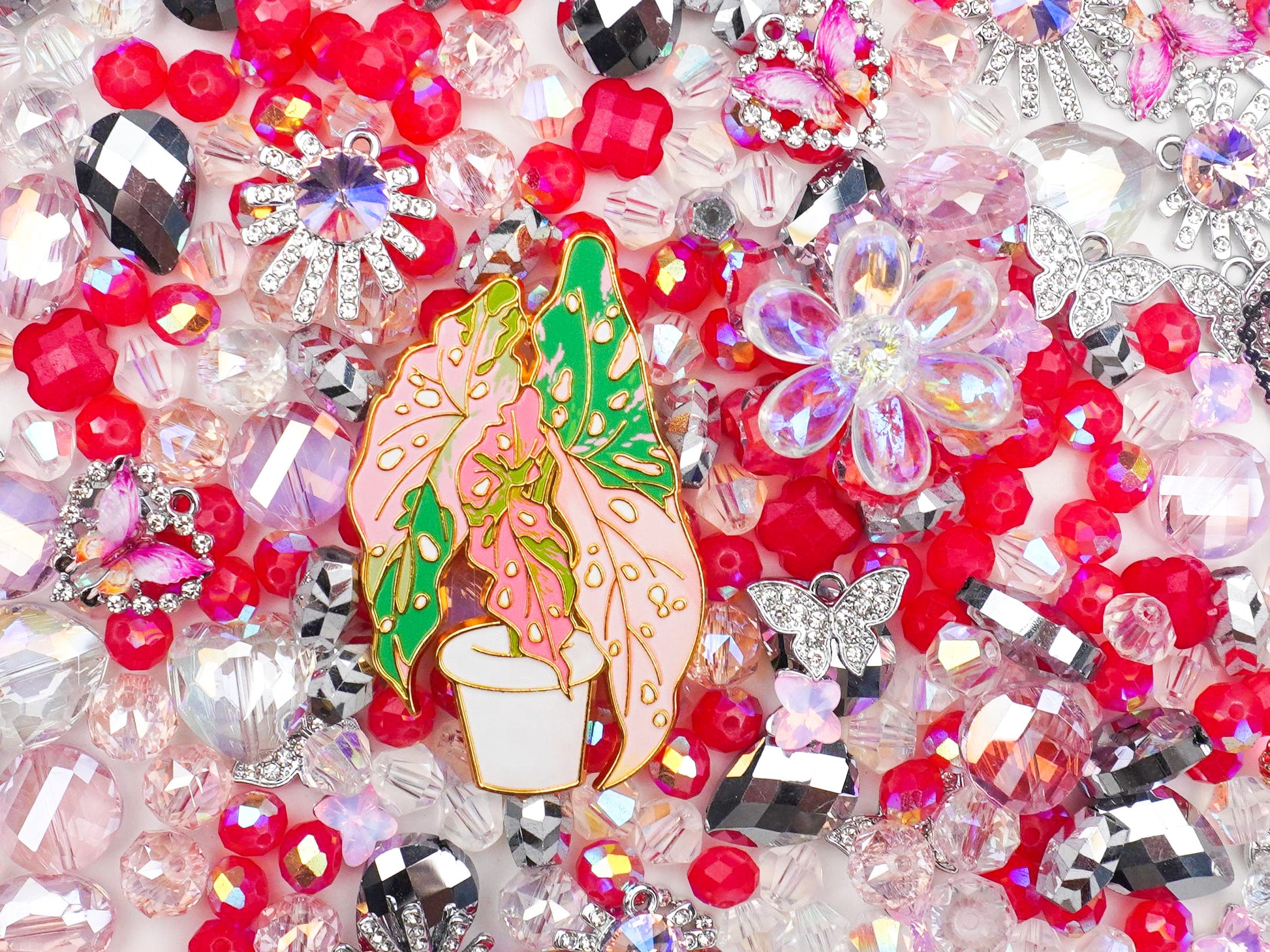 主役は、今SNSでおしゃれなインテリアとして大人気のピンク・プリンセス(観葉植物)のチャーム🌿✨。そこに不思議の国のアリスみたいなチェック柄ビーズや、クールなシルバーバタフライが加わって、レトロでポップなY2Kワールドが全開です🦋。