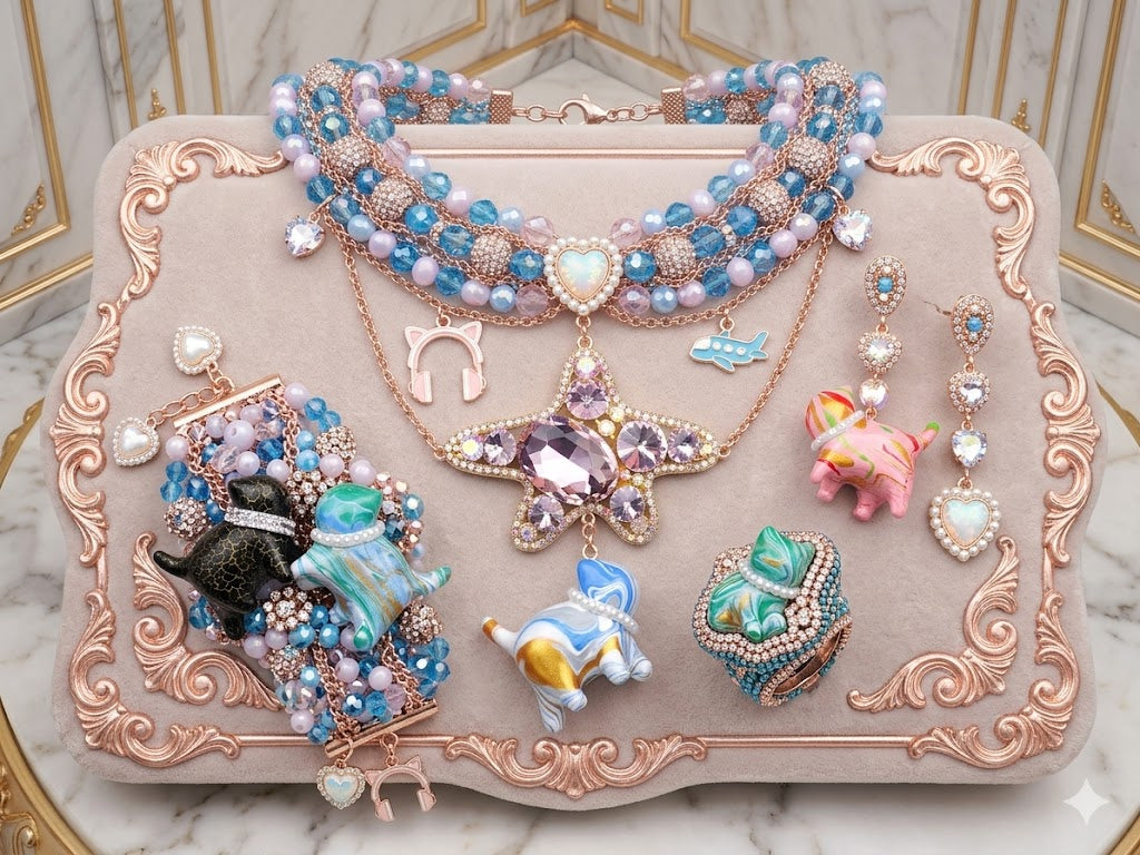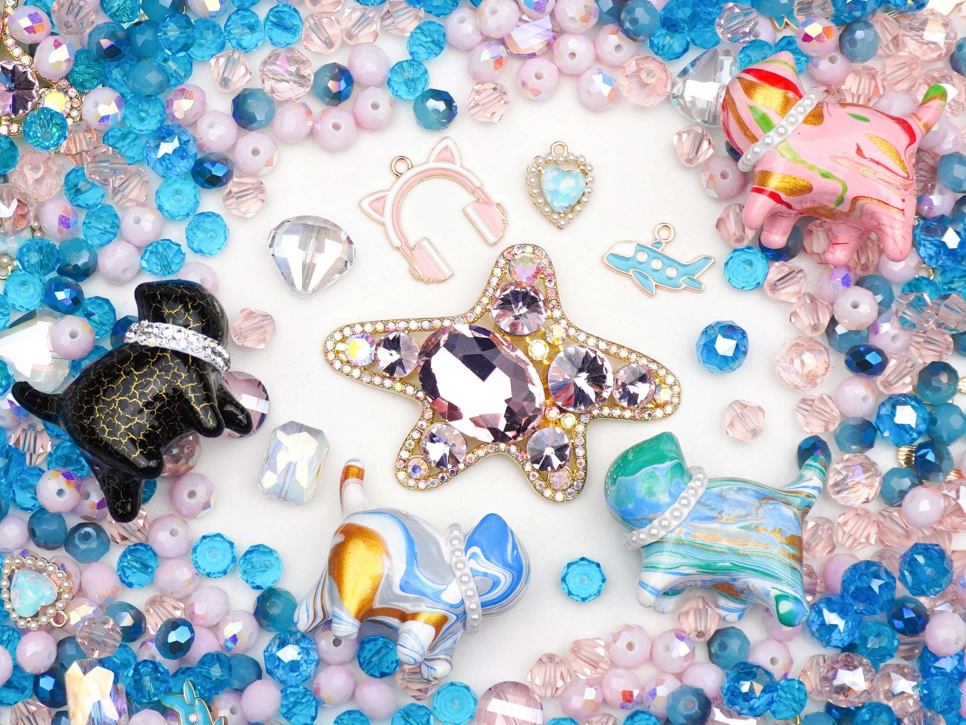 主役級のパーツたちから目が離せない!🎧 マーブル模様のぽっちゃり猫ちゃんや、トレンド感満載の猫耳ヘッドフォン、そしてキラキラ輝く大きなお星さま🌟 小さな飛行機チャームが、あなたをときめく宇宙旅行へ連れて行ってくれます。どれも存在感バツグンで、見てるだけでキュンとしちゃう!🐈🎀