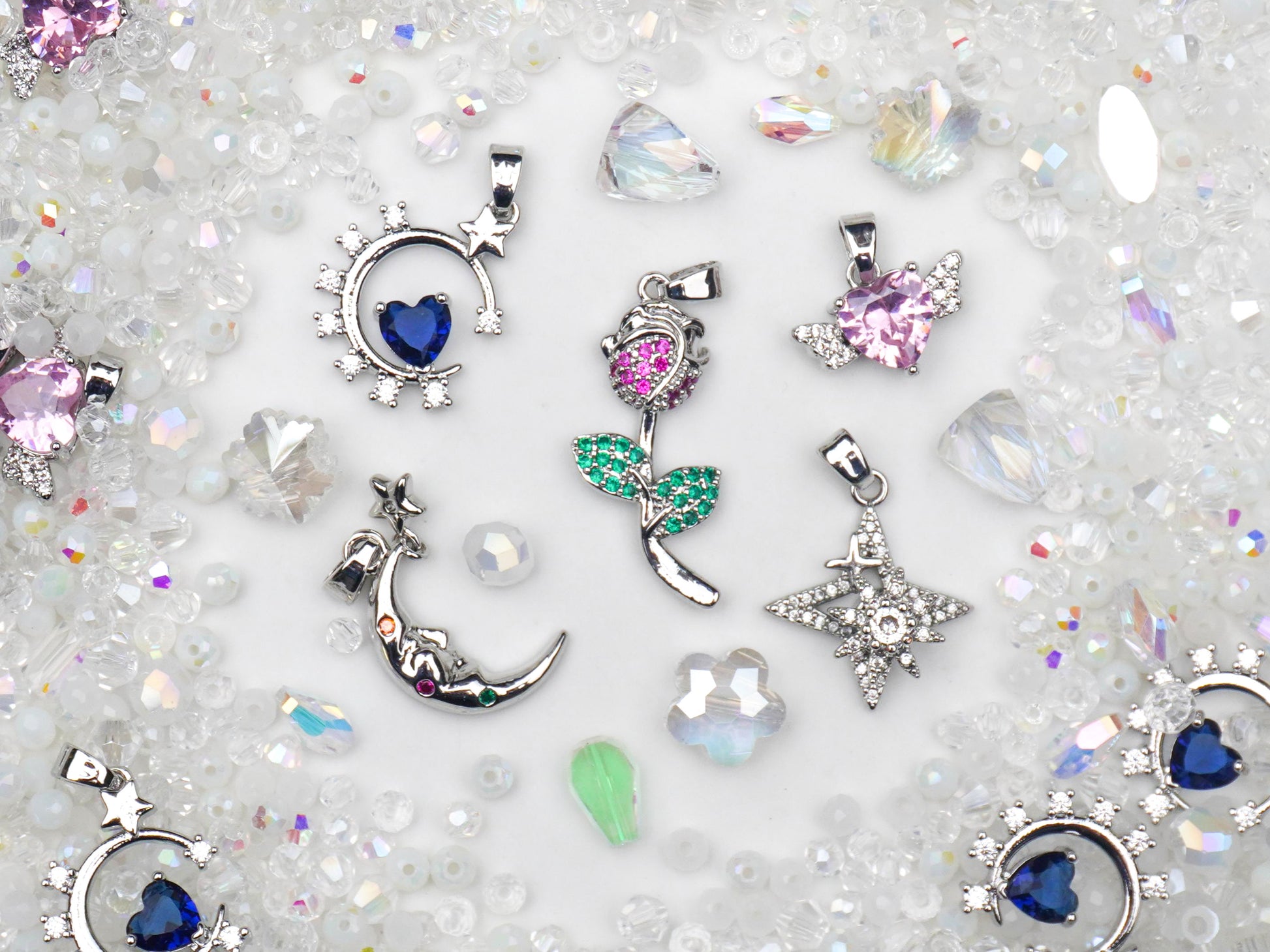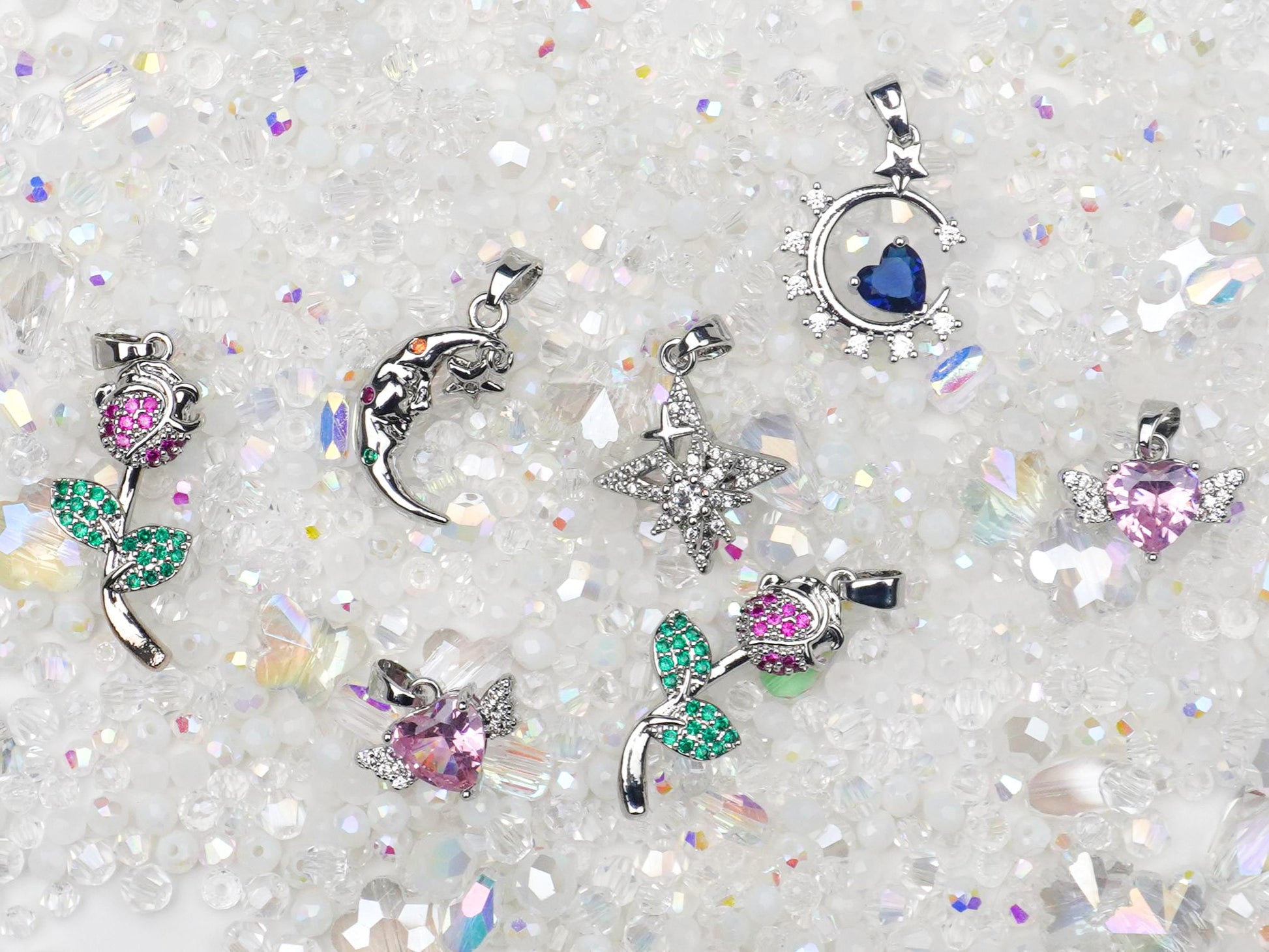真っ白な雪の世界に隠れているのは、天使の羽がついたピンクのハート👼や、深いブルーの夜空を閉じ込めたお月様🌙、そしてロマンチックなキラキラのバラ🌹✨ どのチャームも、冬の澄んだ空気みたいにピュアで特別感たっぷり!今トレンドの「天使界隈」や透明感コーデにも絶対に似合う大優勝アイテムです❄️